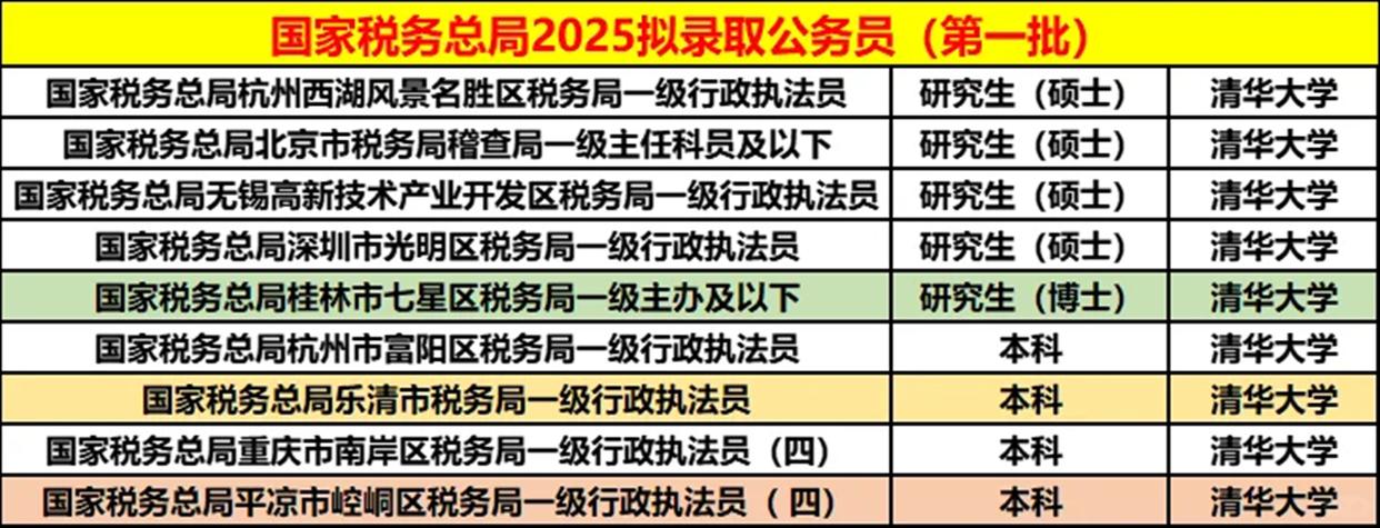 近日,随着国家税务总局2025年第二批录取名单的公布,笔者统计了全国各省市的录取名单,发现包括潘森林在内,今年一共有9名清华毕业生进了税务局。