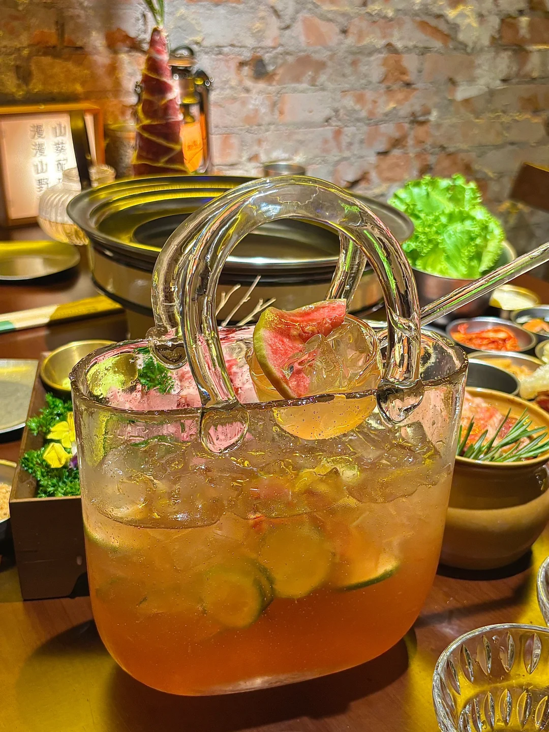装在陶罐里的厚切猪排提前腌制的酱料完全渗透进纹理,烤得滋滋冒油时剪成小块,焦脆边边绝了!
