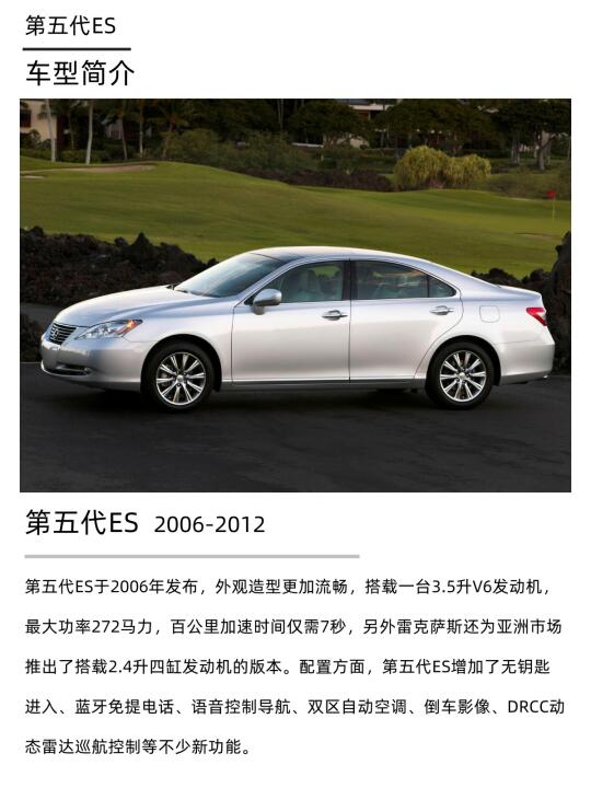 第五代ES于2006年发布,外观造型更加流畅,搭载一台3.5升V6发动机,最大功率272马力,百公里加速时间仅需7秒,另外雷克萨斯还为亚洲市场推出了搭载2.4升四缸发动机的版本。配置方面,第五代ES增加了无钥匙进入、蓝牙免提电话、语音控制导航、双区自动空调、倒车影像、DRCC动态雷达巡航控制等不少新功能。