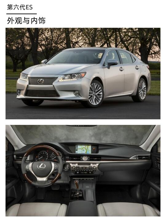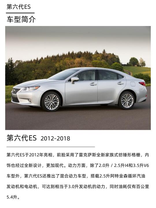 第六代ES于2012年亮相,前脸采用了雷克萨斯全新家族式纺锤形格栅,内饰也经过全新设计,更加现代。动力方面,除了2.0升 / 2.5升I4和3.5升V6车型外,第六代ES还推出了混合动力车型,搭载2.5升阿特金森循环汽油发动机和电动机,可达到相当于3.0升发动机的动力,同时油耗仅有百公里5.4升。