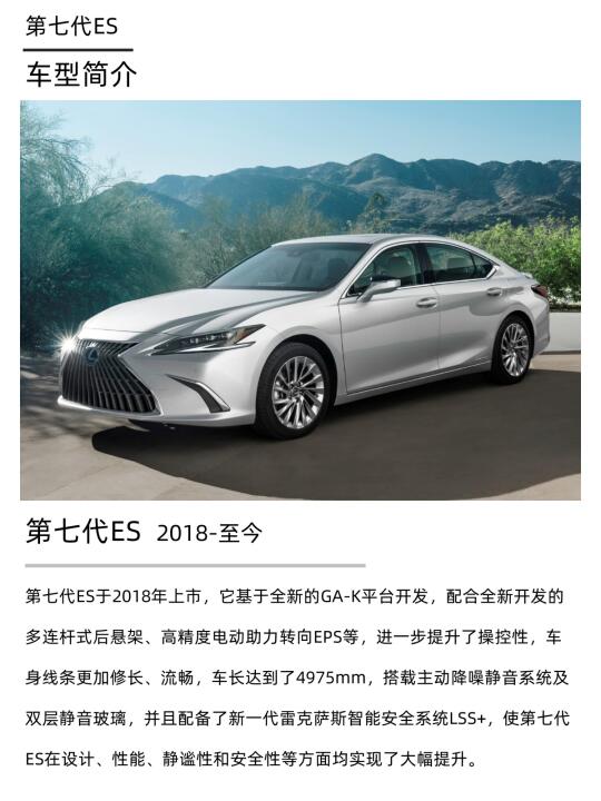 第七代ES于2018年上市,它基于全新的GA-K平台开发,配合全新开发的多连杆式后悬架、高精度电动助力转向EPS等,进一步提升了操控性,车身线条更加修长、流畅,车长达到了4975mm,搭载主动降噪静音系统及双层静音玻璃,并且配备了新一代雷克萨斯智能安全系统LSS+,使第七代ES在设计、性能、静谧性和安全性等方面均实现了大幅提升。