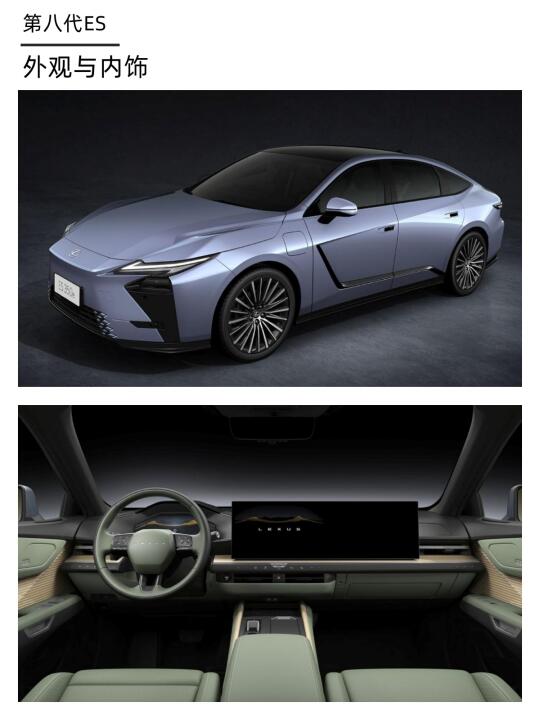 第八代ES采用了全新设计语言,标志性的纺锤形格栅前脸变为了封闭式,外观看起来更像一台新能源车,内饰同样变化巨大,采用了中控屏与副驾屏双连屏的设计。动力方面,第八代ES将推出HEV混动和EV纯电两种动力的车型。