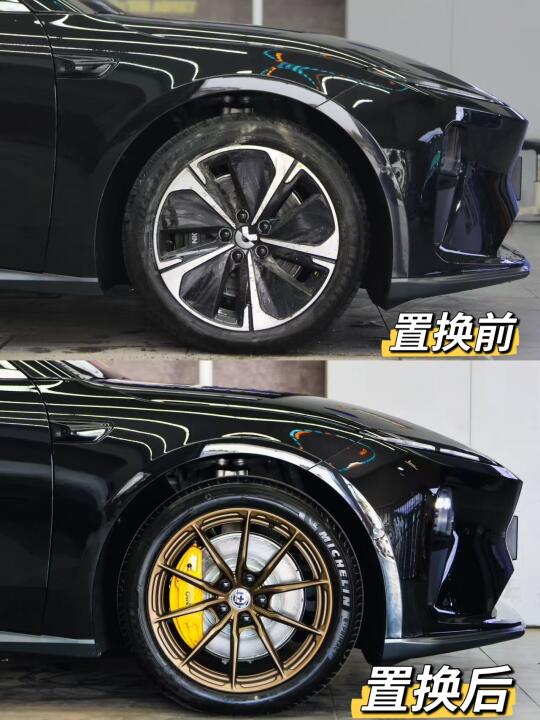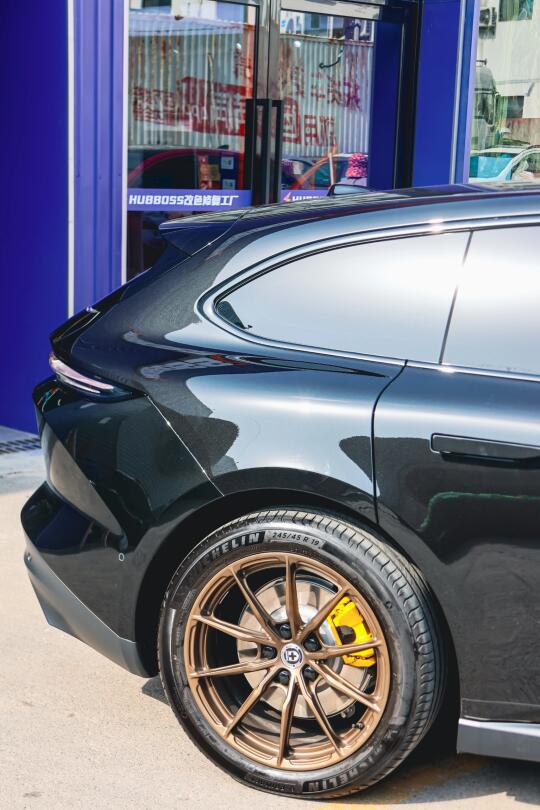 当黑武士遇见古铜轮毂,古铜轮毂条幅如机械齿轮般充满力量设计感,黄色卡钳若隐若现,搭配超亮的车衣防护和玻璃膜,整车教科书级别性价比改动,这分明是赛博都市里的移动艺术品!
