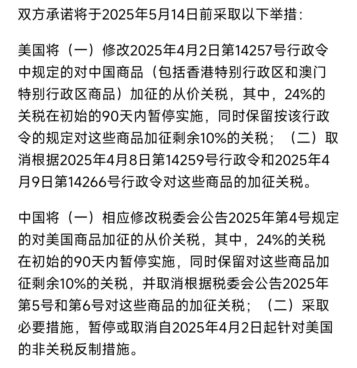 中美取消对等关税,保留34%的关税博弈空间,5月12起暂停90天的24%的关税,执行10%的基础关税政策。 这次美方认清了中国的实力。关税的武器失效,前期说的武力威慑可能不会有了,我国的军事实力也让民众吃了定心丸。 后期双方在科技竞争、供应链重构等领域的矛盾仍存。 国际形势变好,A股月线,周线,日线结构良好,近期几个月可能会冲击4000点,甚至更高。