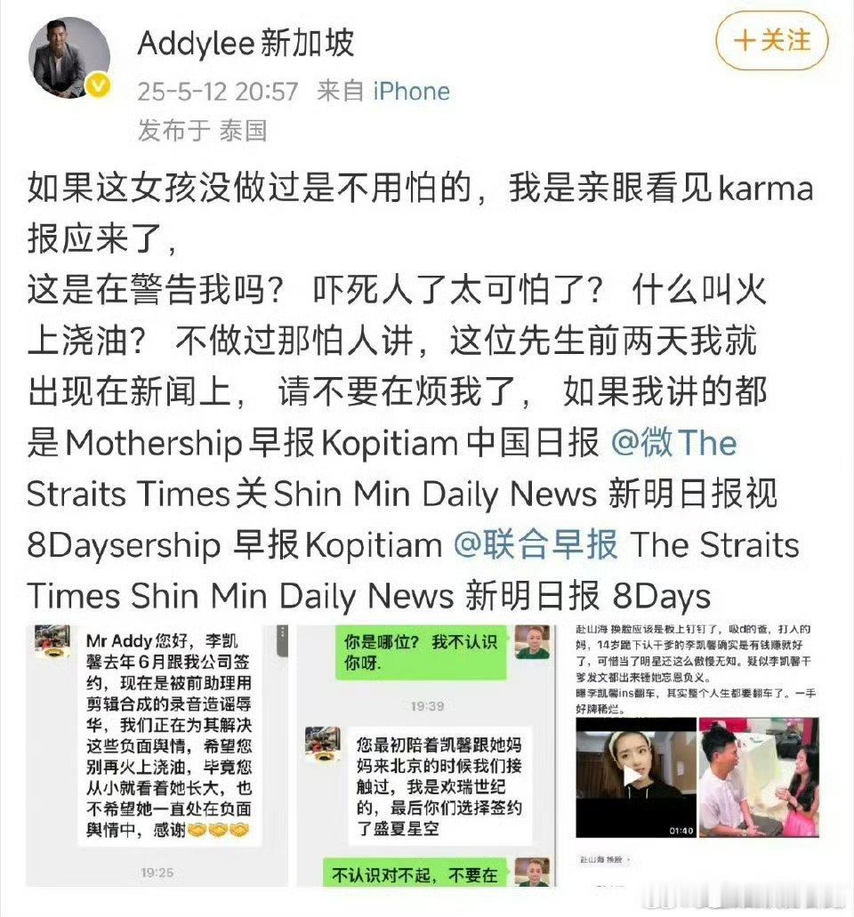 疑似欢瑞工作人员找李凯馨的干爹,叫他别火上浇油,万万没想到人家不吃这一套,直接把