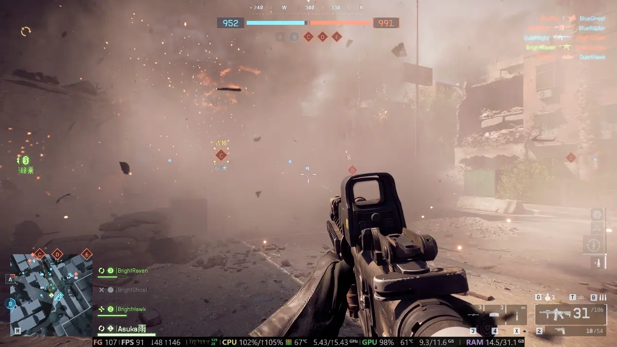开罗围城是《战地6》的“拆楼主战场”——这边你用火箭筒轰穿天花板,那边敌人用坦克炸塌承重墙,整个场景全是破坏后实时掉落的碎砖、扬尘和火光。之前用家里的老伙计玩,一旦双方同时拆楼,帧率直接从80掉到40FPS,画面明显有卡顿感。