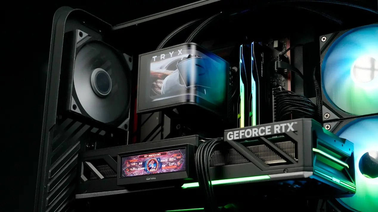 是不是迫不及待了,接下来就赶紧看看主机长什么样吧!在开机瞬间我直接被狠狠拿捏——iGame Vortex海景房全家桶把内部光效展现得明明白白。显卡的RGB光效、智屏和内存灯效、散热器屏幕连成一片,暗光环境下像个发光的战地指挥中心,科技感直接冲破屏幕。