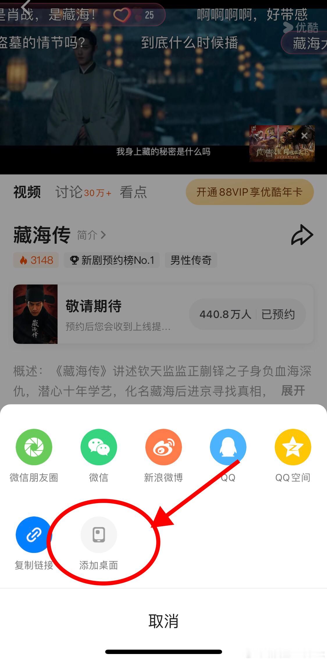 如图所示,先在“优酷”APP首页搜索《藏海传》,然后按照附图提示的步骤操作,就能在电子设备屏幕上获得独立于优酷APP之外的《藏海传》专属图标啦![送花花]直接点击新图标即可直达《藏海传》观看页面![666]