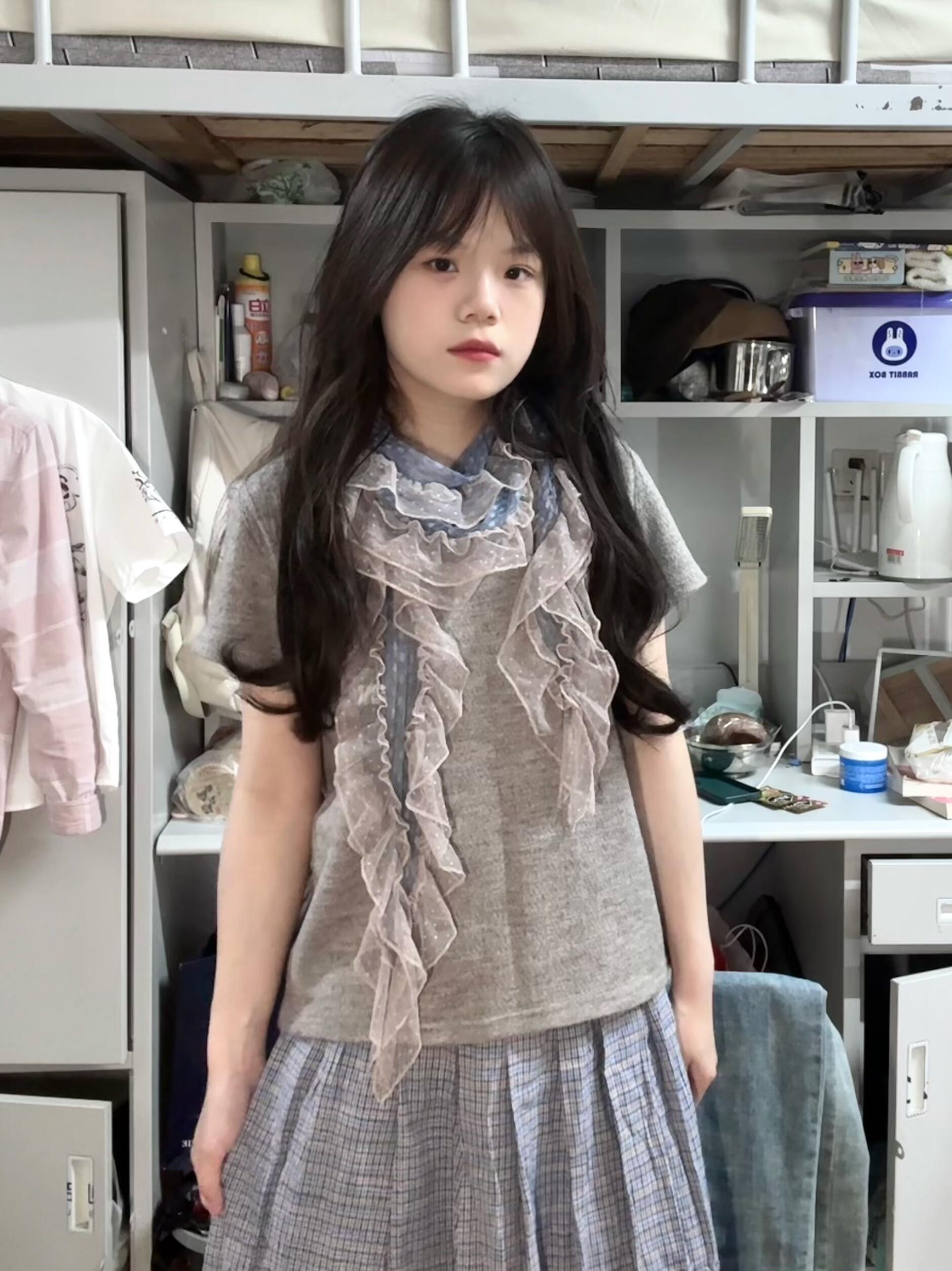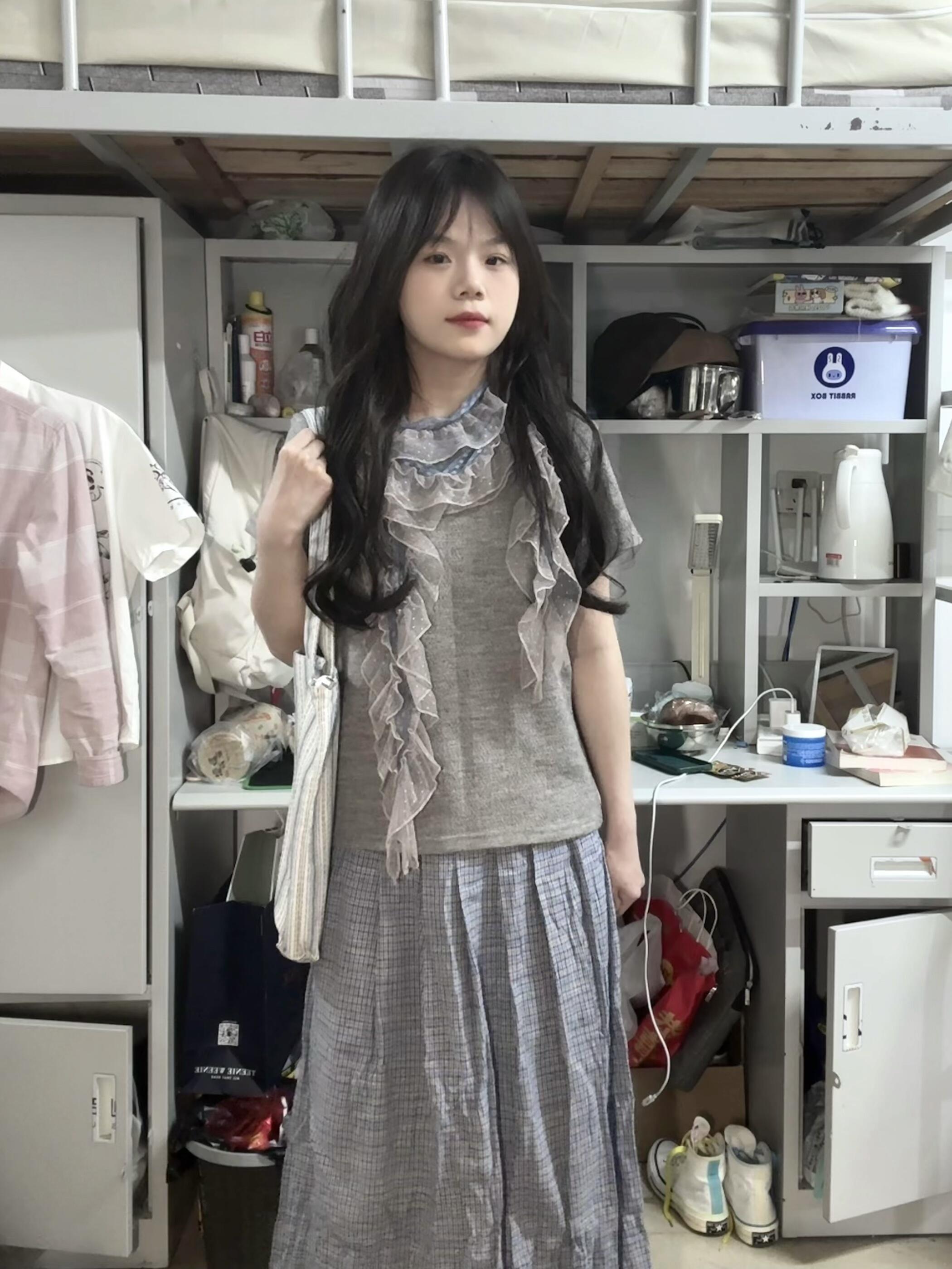 简单不费力懒人通勤穿搭!灰色T恤+蓝色半裙