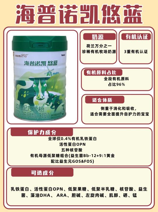 👉海普诺凯悠蓝:不仅是唯一含有全球仅0.4%有机乳铁蛋白的有机奶粉,还有活性蛋白OPN、五种核苷酸、有机母源低聚糖组合一起拉升宝宝体质,可选成分也很全面,宝宝成长所需的高含量DHA、ARA、胆碱都添加在其中。👏