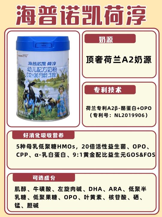 👉海普诺凯荷致:主打全面自护营养群,有高纯度高量乳铁蛋白,乳源燕窝酸,免疫球蛋白IgG,5种母乳低聚糖HMOs都是能直接作用到宝宝自护系统,增强体质少中招。👏而且这4个成分也是高端奶粉才会添加的臻稀营养。除了有水解小分子蛋白+生物活性肽CPP,9:1黄金配比益生元GOS&FOS+益生菌让肚肚舒适,营养好吸收的成分,💪还有一个封神独家荷兰专利A2β-酪蛋白+OPO(专利号:NL2019906),结构贴近初源亲和好吸收,OPO还能够锁住脂肪和钙质,宝宝每天收获成型噗噗,吃得好睡得香。🥰