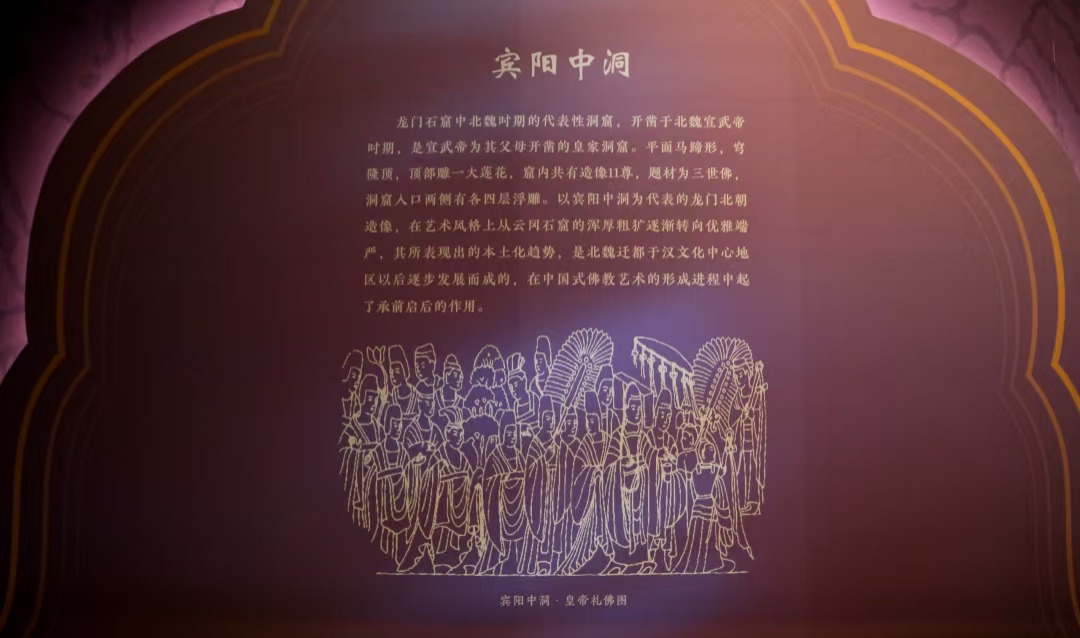 展览在北魏晚期佛造像这部分的例证,说实话,我要是策展人,我不这么布展。展板上给的例子是龙门的宾阳中洞,这确实是非常典型的北魏晚期佛造像实例,文字讲的是佛教艺术的本土化,但是,线描图给了个《帝后礼佛图》,这张图更适合去证明孝文帝汉化改革“禁止穿鲜卑服装”的部分,呈现了礼仪性服装继承了魏晋风格。展厅里有一张巨幅照片倒是能很好地证明北魏晚期造像风格,选用的是龙门的“莲花洞”,但是找了半天没有给标注,一般观众不知道出处,甚至还有观众小说嘀咕“这是敦煌吗?“,照片出现的位置也很奇怪,放在了魏碑的部分,下面的展柜一溜都是魏碑,上面出现”莲花洞“,这里不该放个”古阳洞“吗?魏碑中的杰出代表《龙门二十品》中的十九品都在古阳洞。展览上其他的例子,南涅水的四面造像石塔上倒是有北魏晚期的实例,但是由于这件文物比较特殊而且很有意思,后面单独说它。