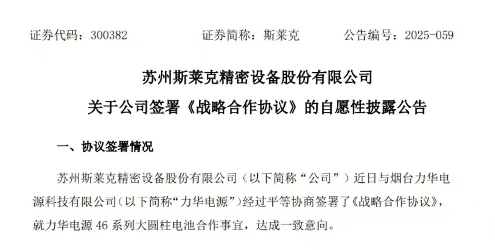 大圆柱电池 日前,苏州斯莱克精密设备股份有限公司披露其与烟台力华电源科技有限公司就力华电源46系列大圆柱电池合作事宜达成意向。根据《战略合作协议》,双方将持续推进在46系列大圆柱电池零部件的开发合作,斯莱克将充分利用在大圆柱电池精密安全结构件领域的优势,助力力华电源开发具有高倍率性能、高能量密度、长循环寿命、极致安全的电池产品。当合作项目出现对合作产品的需求时,双方应在同等条件下优先推介和采购合作产品。
