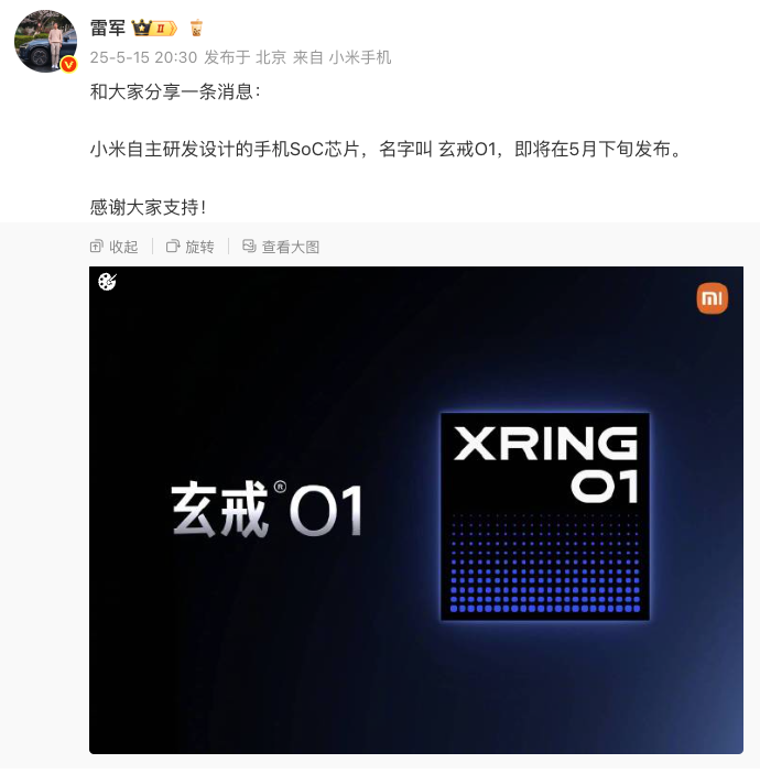 玄戒O1!小米自研手机SOC芯片正式官宣