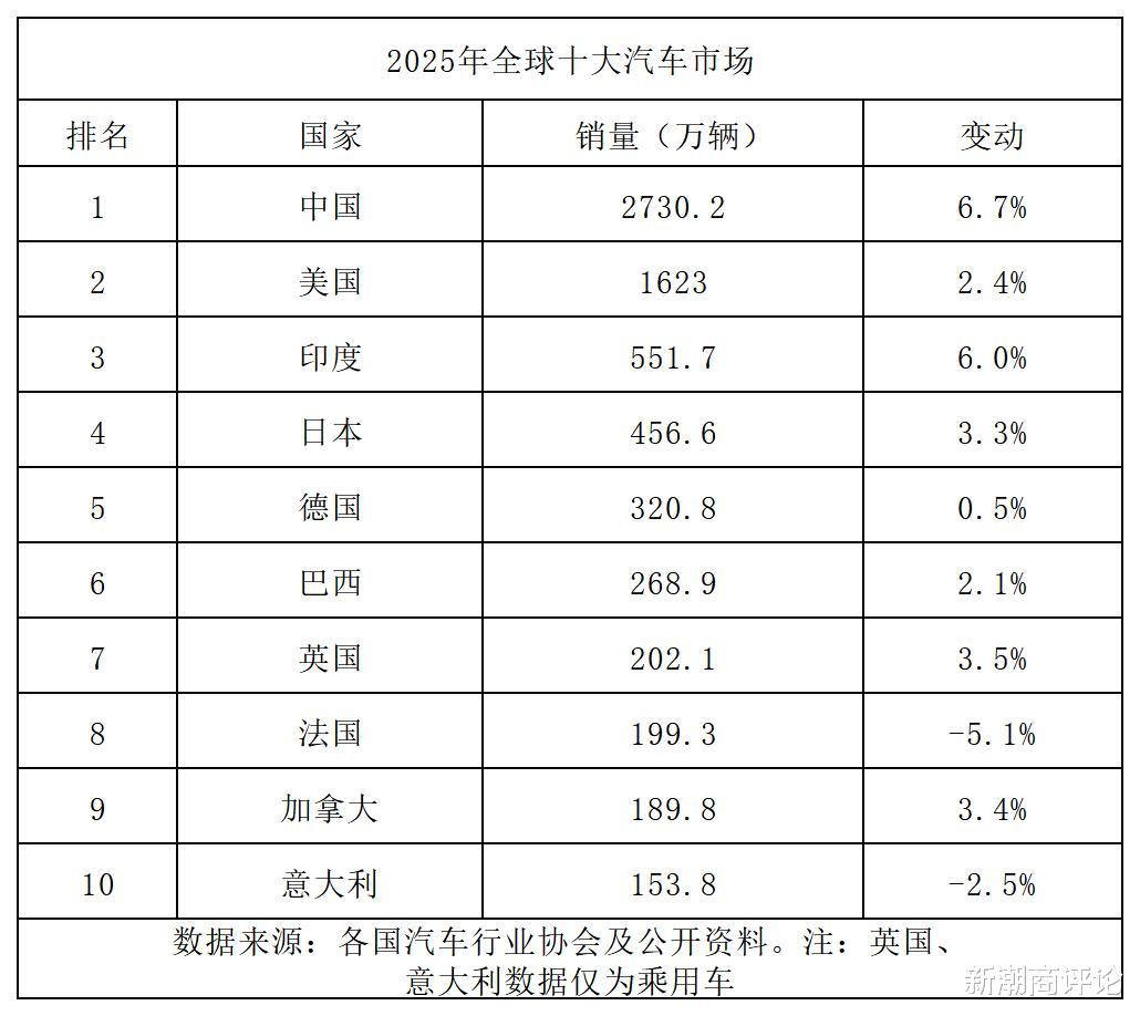 排在第6位的是巴西,同比增长2.08%至268.917万辆,其中轻型乘用车及轻型商用车254.946万辆,较2024年增长2.58%。英国位列第七,乘用车新车销量为2,020,520辆,同比增长3.5%,自2019年以来首次突破200万辆大关。