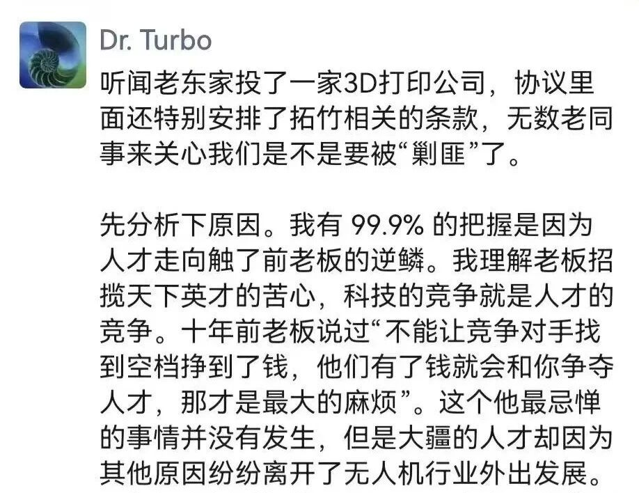 这位大疆前高管直言,老东家投资了一家3D打印公司,并且“协议里面还特别安排了拓竹相关的条款”,并坦言是因为“人才流向触动了前老板的逆鳞”。
