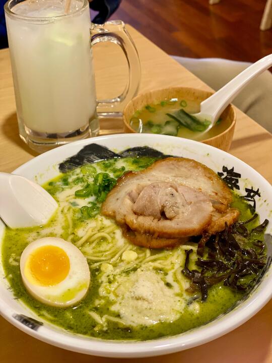 第一次吃绿色的拉面,真的很好吃,超喜欢pesto的口感,汤也很香浓,一口气吃完😍