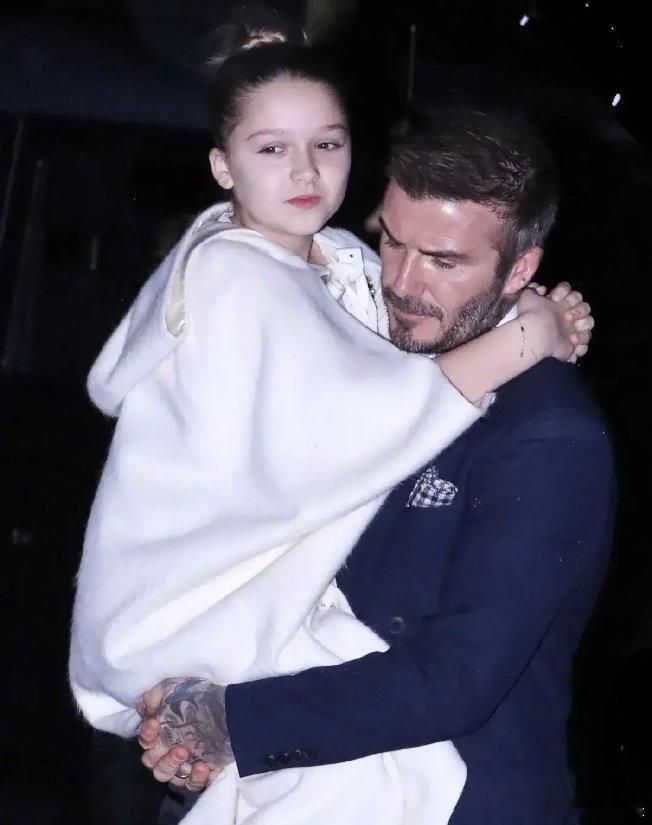 那年,8岁的小七受洗仪式结束, 外面下着雨, 贝克汉姆怕女儿脏了鞋, 把已经不算小的小女儿一把抱在怀里……