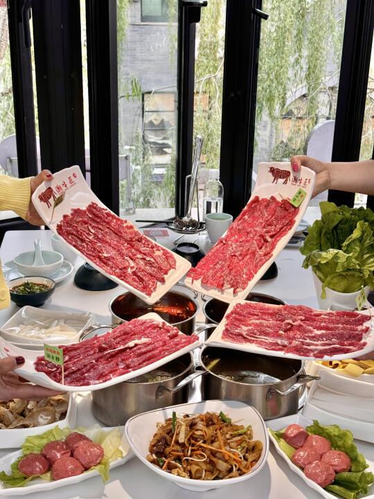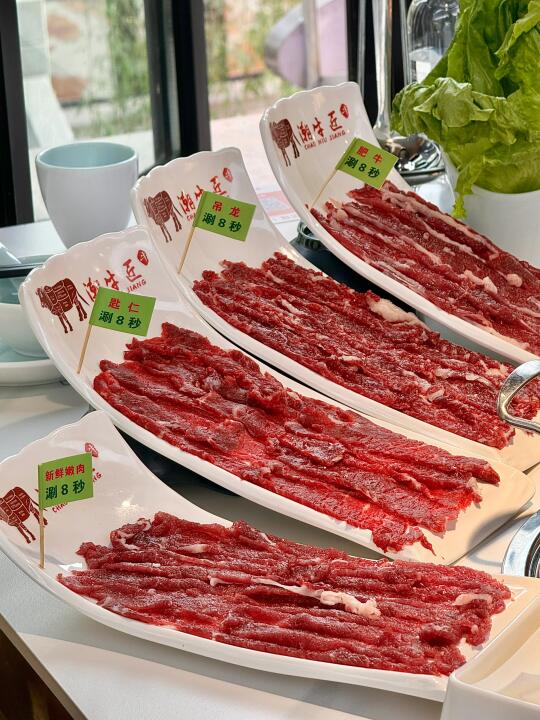 每盘牛肉的量非常大 直接堆满(不像别家只是薄薄铺一层)牛肉纹路分明每一盘都很漂亮!!涮一会捞起来配沙茶酱吃 真的巨嫩美味无边哈哈哈!!