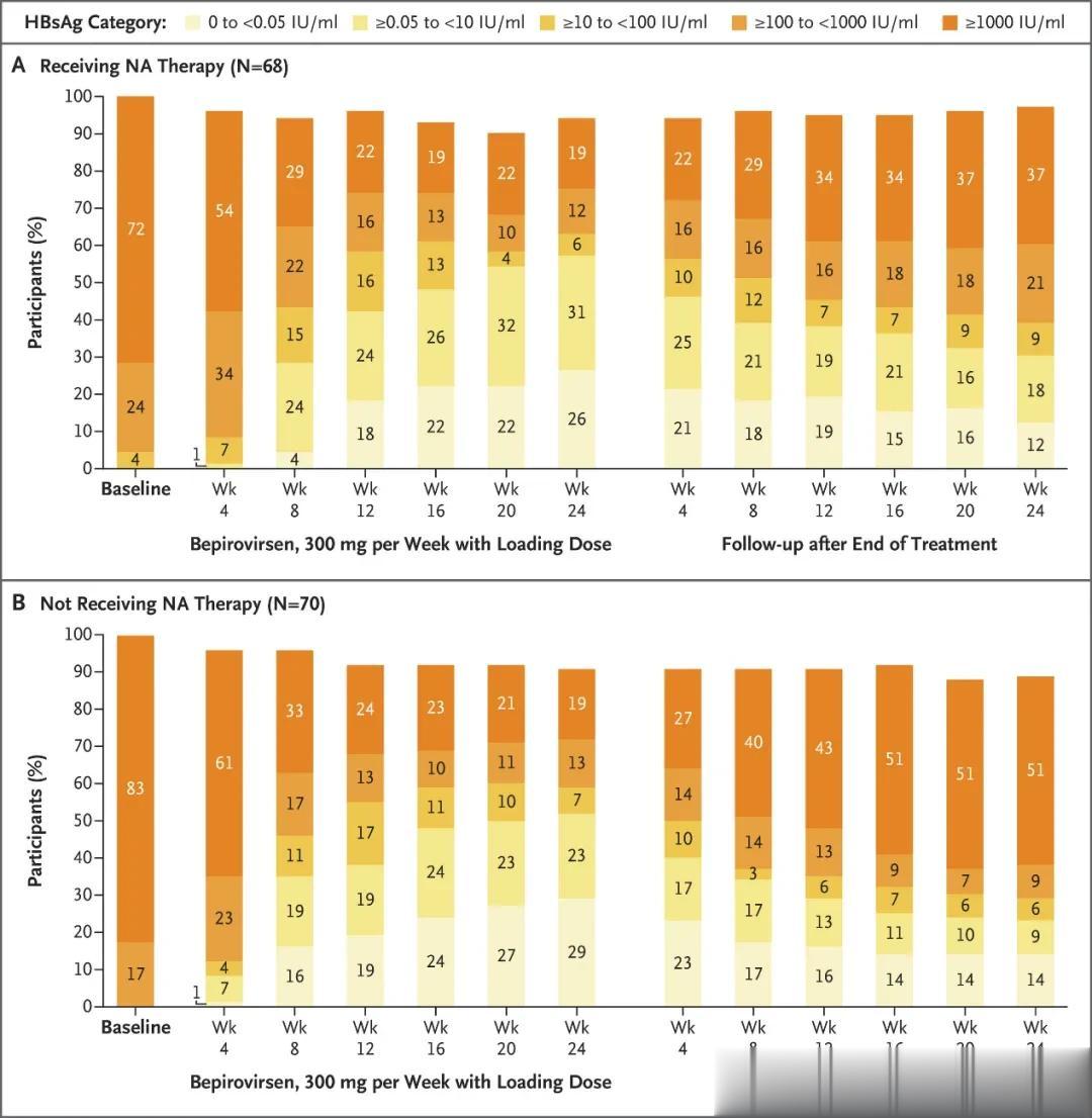 在此前的II期临床研究B-Clear中[10],每周300mg,持续24周的Bepirovirsen治疗使得9%~10%的慢性乙肝患者持续清除HBsAg和HBV DNA。