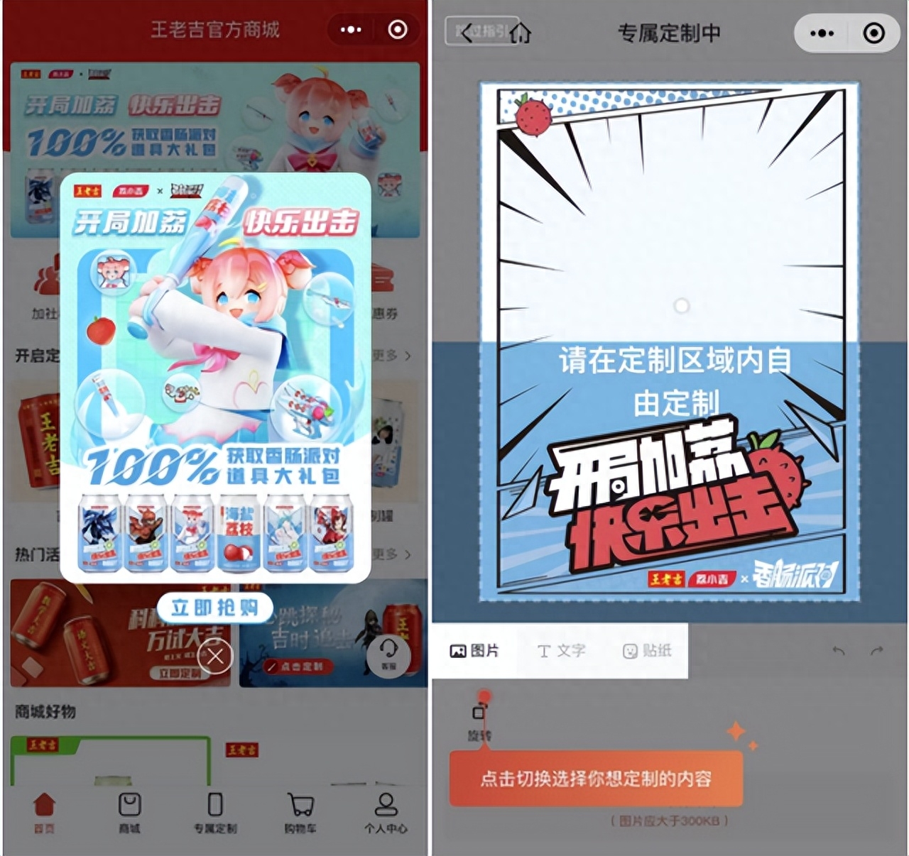 另一方面,是为了两段式的加强新生代消费者的互动参与体感。两个品牌分开两次的活动信息触达,更加有利于此次联名IP罐、联名定制罐等联名定制产品,进行销售端的转化承接。通过开盖有奖以及小程序抽奖的互动形式,放送游戏内道具大礼炮,让消费者在购买产品的同时,能够获取荔小吉定制道具,既得线上的游戏体感,也能亲身体验产品的清爽口感,让好感度倍增。
