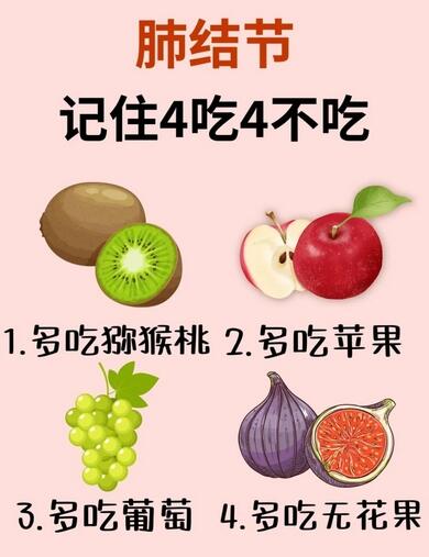 肺结节4个少吃: 少吃虾 少吃芒果 少吃榴莲 少吃蛋糕 肺结节四个多吃: 多吃猕猴桃 多吃苹果 多吃葡萄 多吃无花果 中医 肺结节 结节
