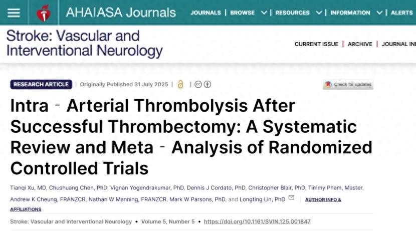 急性缺血性卒中作为致残与致死率较高的脑血管疾病,尽管随着研究不断深入,诊疗技术不断突破,治疗率逐步提高,但是疾病负担依然严重。近年来,血管内取栓术(EVT)已成为治疗急性缺血性卒中的重要手段,但患者术后功能预后存在较大的个体差异。为了提升治疗效果,一项发表于Stroke: Vascular and Interventional Neurology的研究,通过系统评价和荟萃分析,评估了在EVT后进行动脉内溶栓(IAT)治疗的潜在益处。