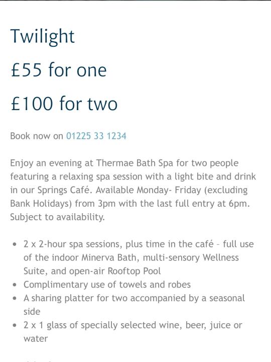 之前在巴斯住过一段时间,但是不知道为什么一直都不太有打卡这个spa的冲动,倒是搬到伦敦之后总是心心念念想要去体验一下[暗中观察R] 这次体验的是ta家的Twilight for 2,工作日下午3-6pm随时都可以进场,包含两个人的门票➕泡完温泉后在1楼café的简餐和drink,一共是100胖子[偷笑R]