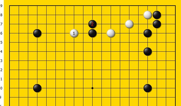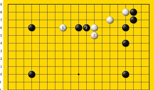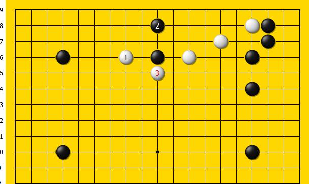 黑先,黑棋2如果首先在四线横顶呢?黑棋3是可以向五线挺,来补强自己的弱子,同时强化自己的棋形! 那么黑棋该如何行棋,才能利用分断的手筋,来将两边的白棋分断开来呢? 由于白棋1是位于四线,位置有点高,要分断白棋,黑棋2采用玉柱的方法,是当前状态下,对白棋最强的分断的方法!