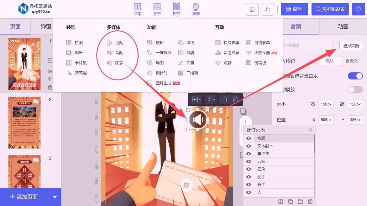 完成【精细化编辑】→ 双击预览区文图,替换为自己的内容,右侧【属性设置】可调整字体、颜色、大小;点击左侧【控件】,可添加一键拨号、表单、音频等互动元素;点击【设置】,可添加翻页动画、载入动画,打造更具质感的H5。
