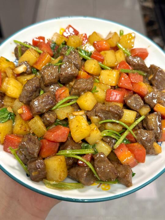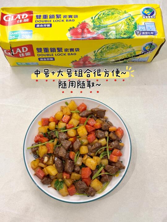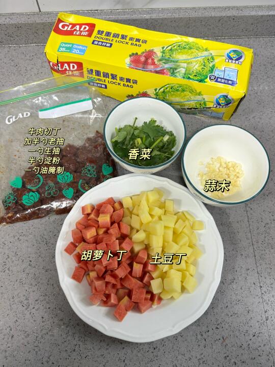 1️⃣牛肉切丁,加半勺老抽、一勺生抽、半勺淀粉、一勺食用油放密封袋腌制20分钟