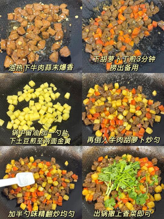 3️⃣锅留底油,加一勺盐,加入土豆丁煎至两面金黄,倒入牛肉胡萝卜翻炒均匀