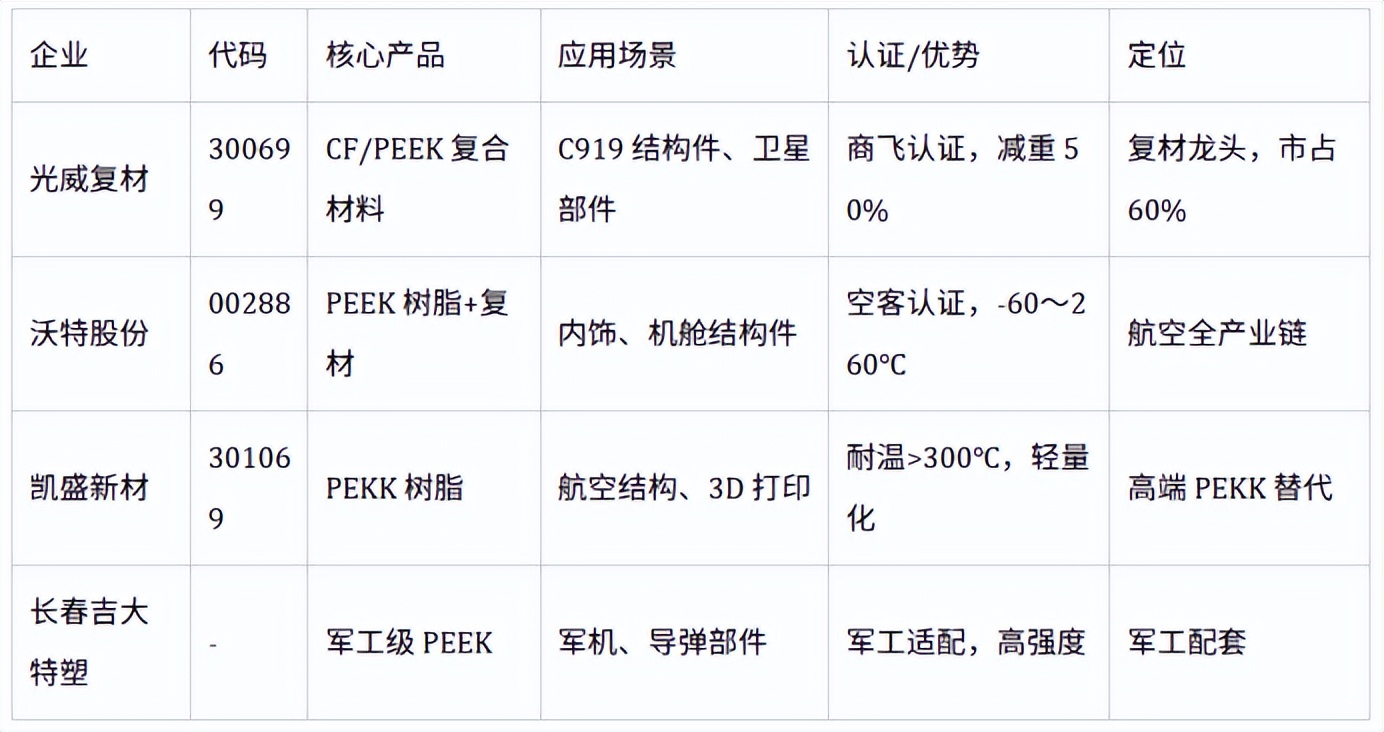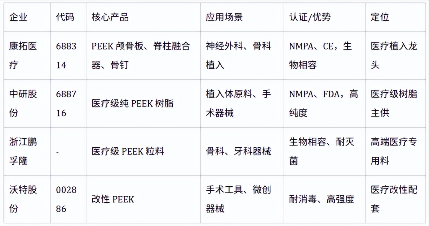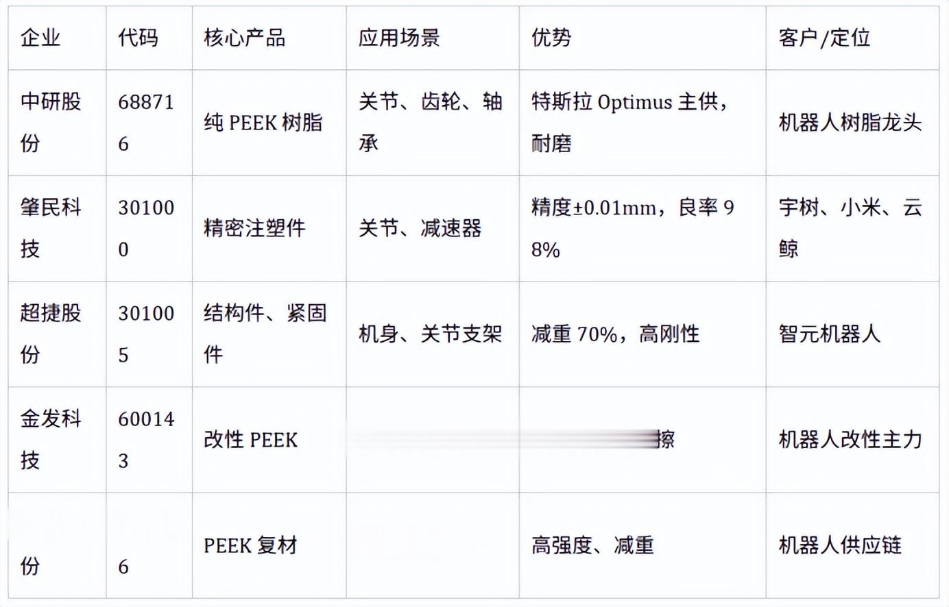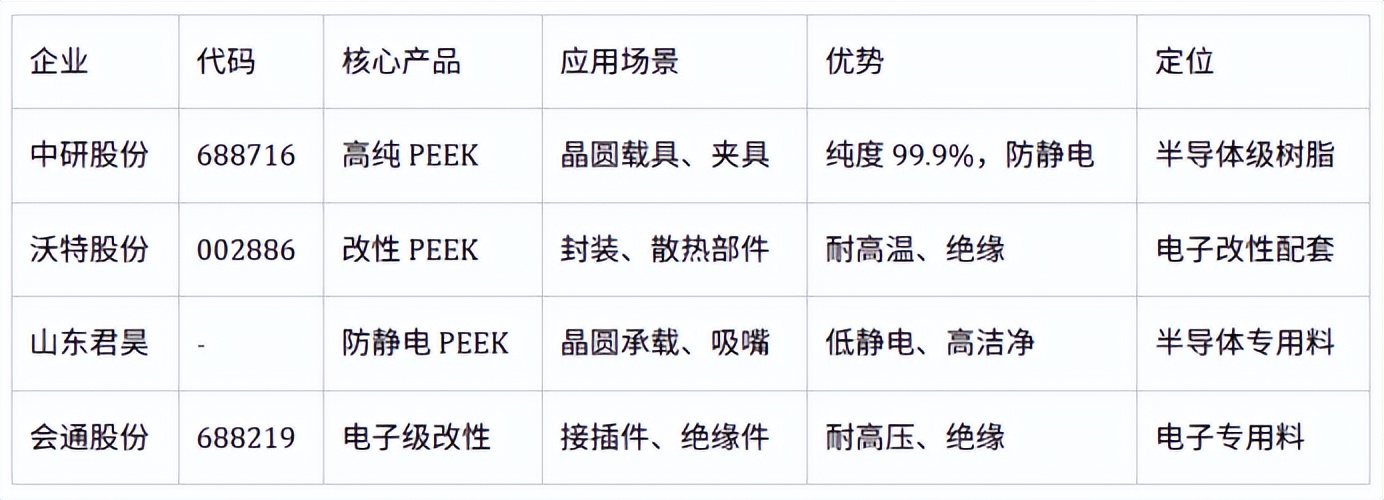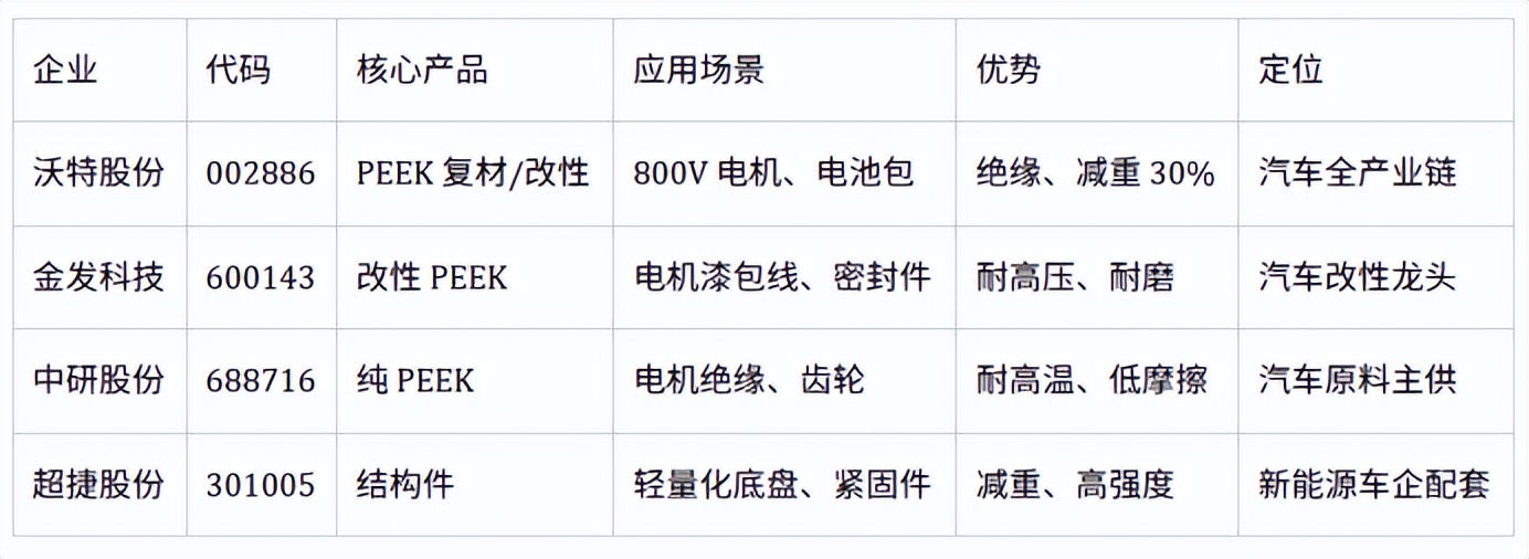 以下为国内PEEK核心企业按医疗、航空航天、人形机器人、半导体/电子、新能源汽车五大热门应用场景的匹配表