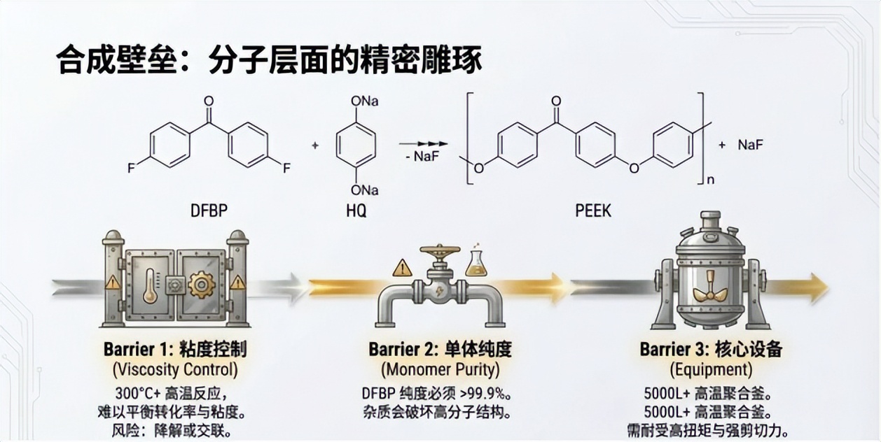PEEK的高性能背后,是分子层面的精密合成与生产端的严苛技术要求,其主流合成路线为亲核取代法:在280-350°C的高温环境下,以4,4'-二氟苯甲酮(DFBP)和对苯二酚(HQ)为核心单体,在二苯砜溶剂中通过碱金属盐催化缩聚,且需让DFBP略过量以产生稳定氟端基,残留盐则通过多级处理去除,才能保障材料的绝缘与力学性能。而规模化生产的核心,在于突破三大技术壁垒: