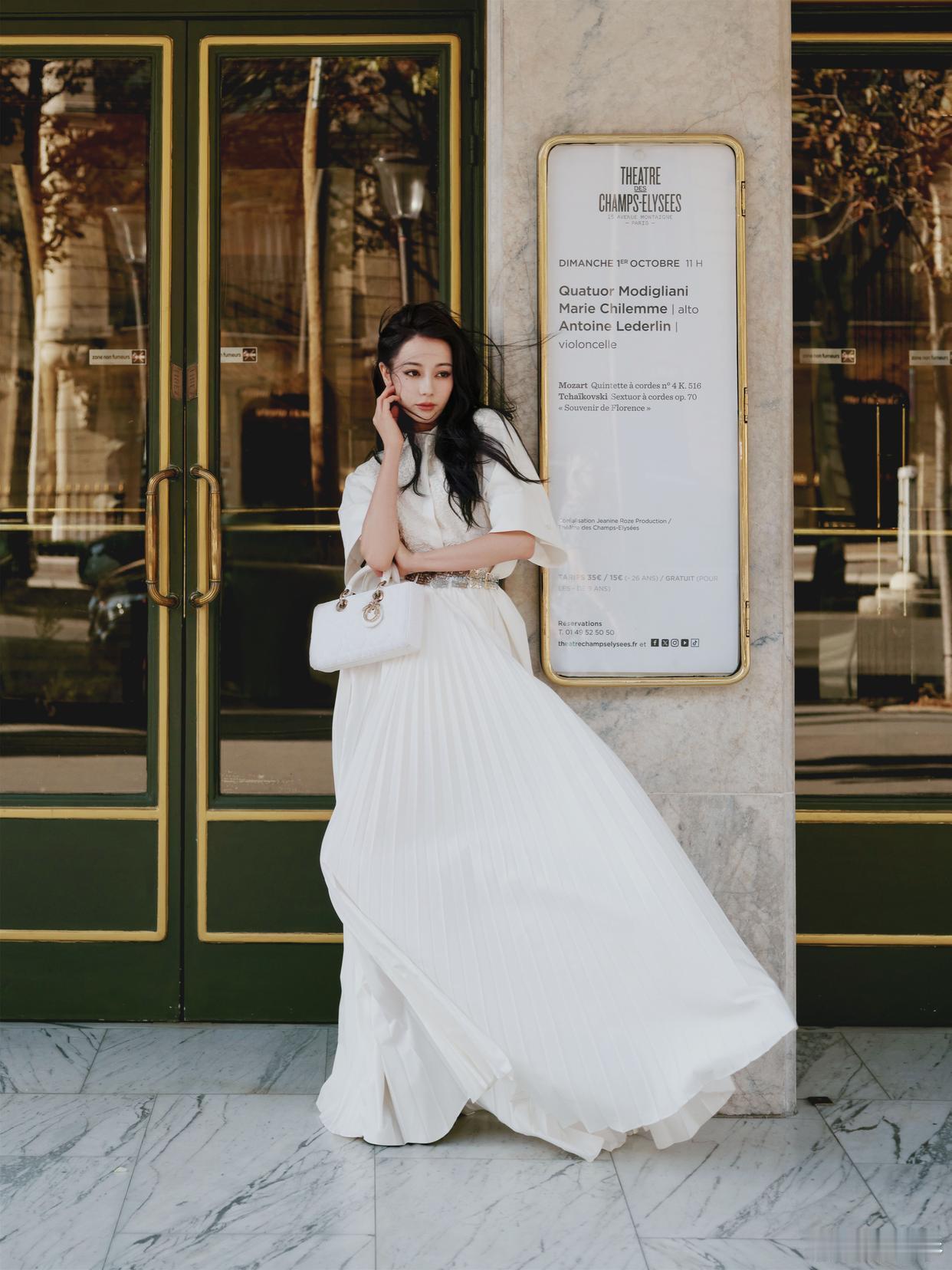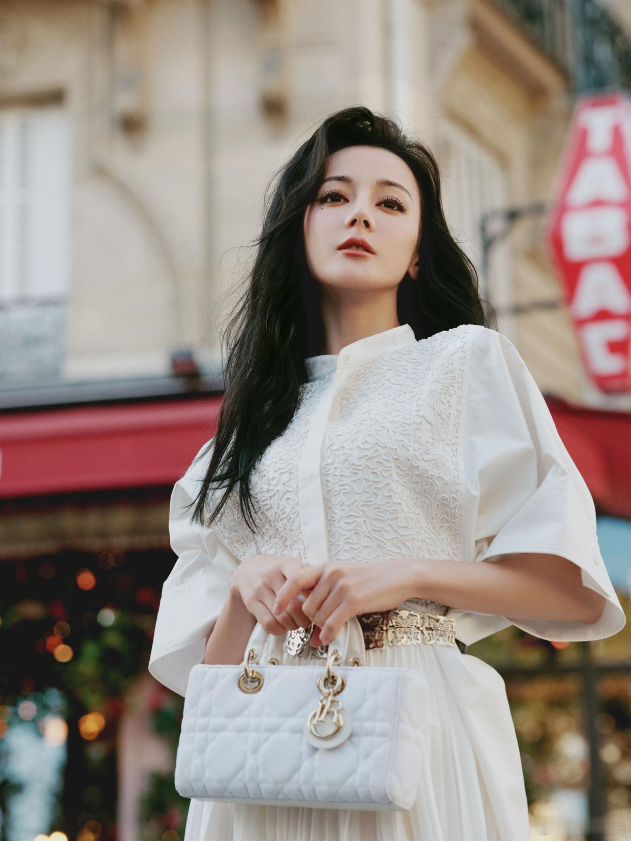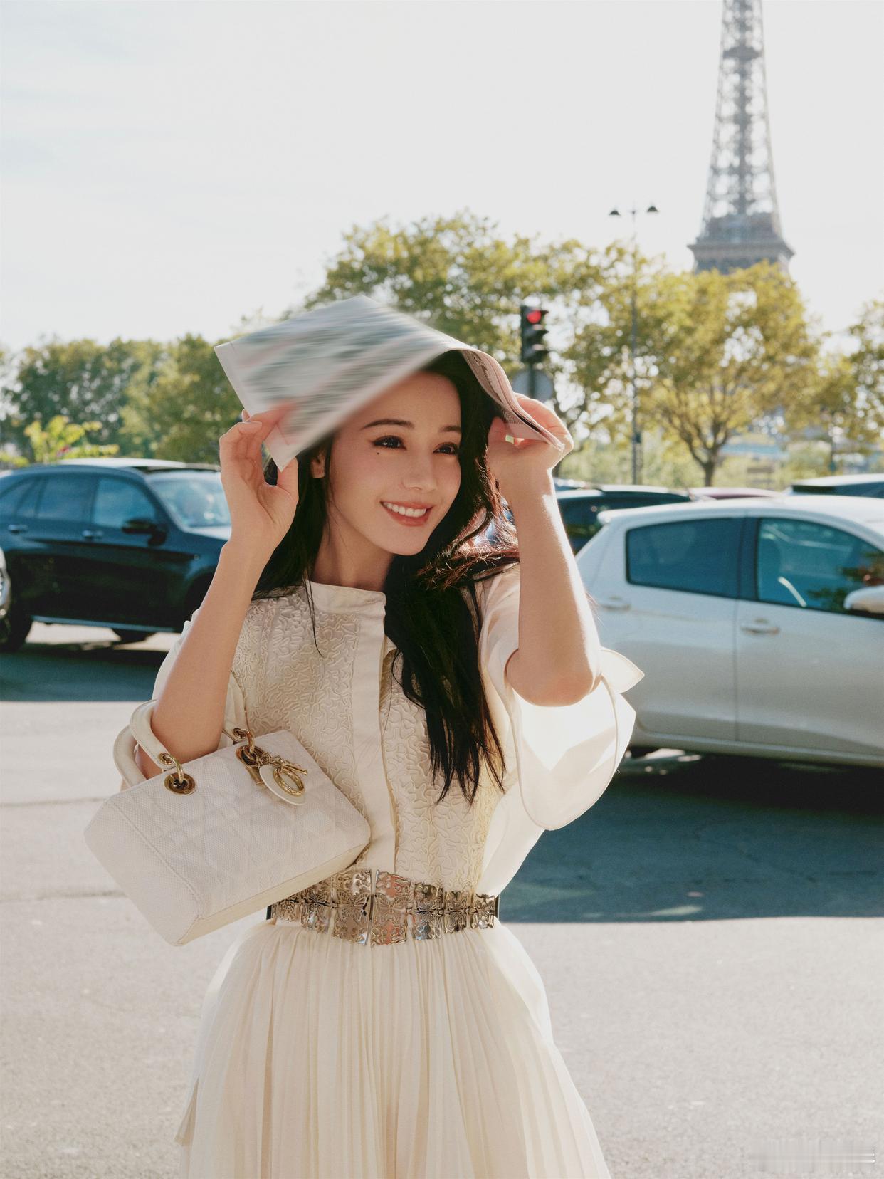 迪丽热巴撕拉片迪丽热巴Bonjour巴黎浪漫街拍写真:一身白色长裙,相约秀场,恬