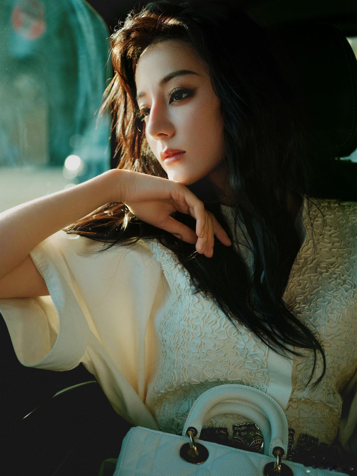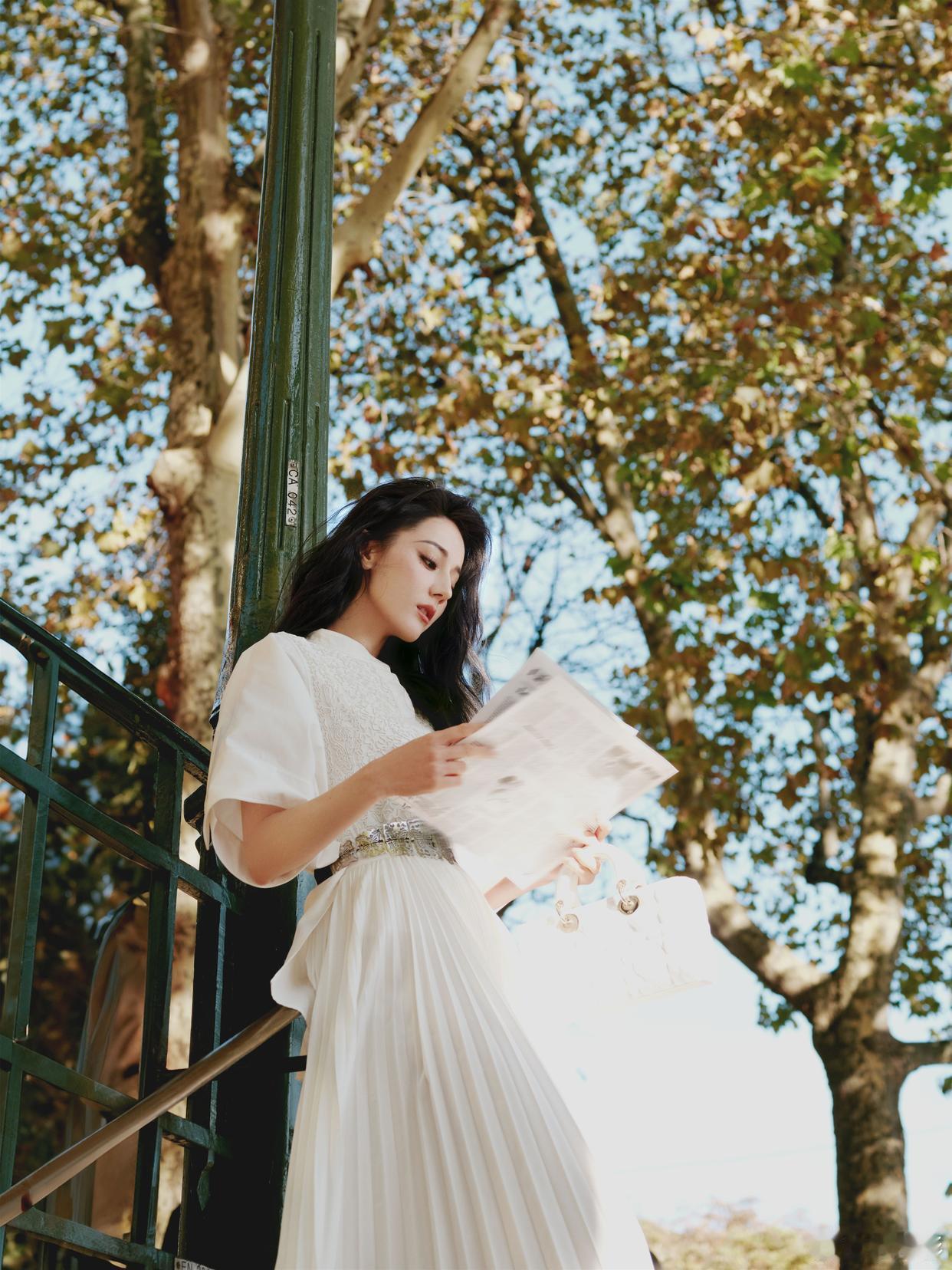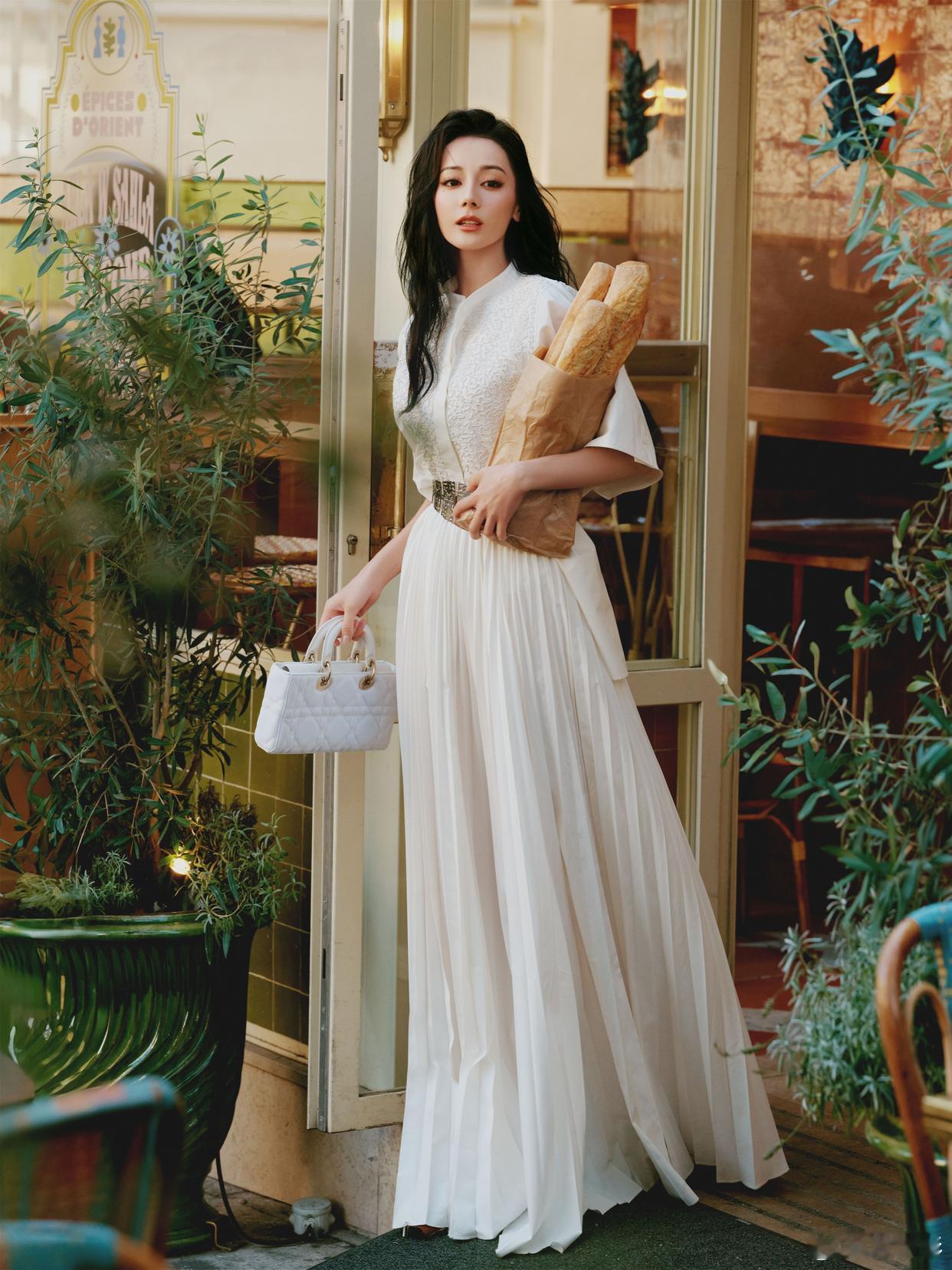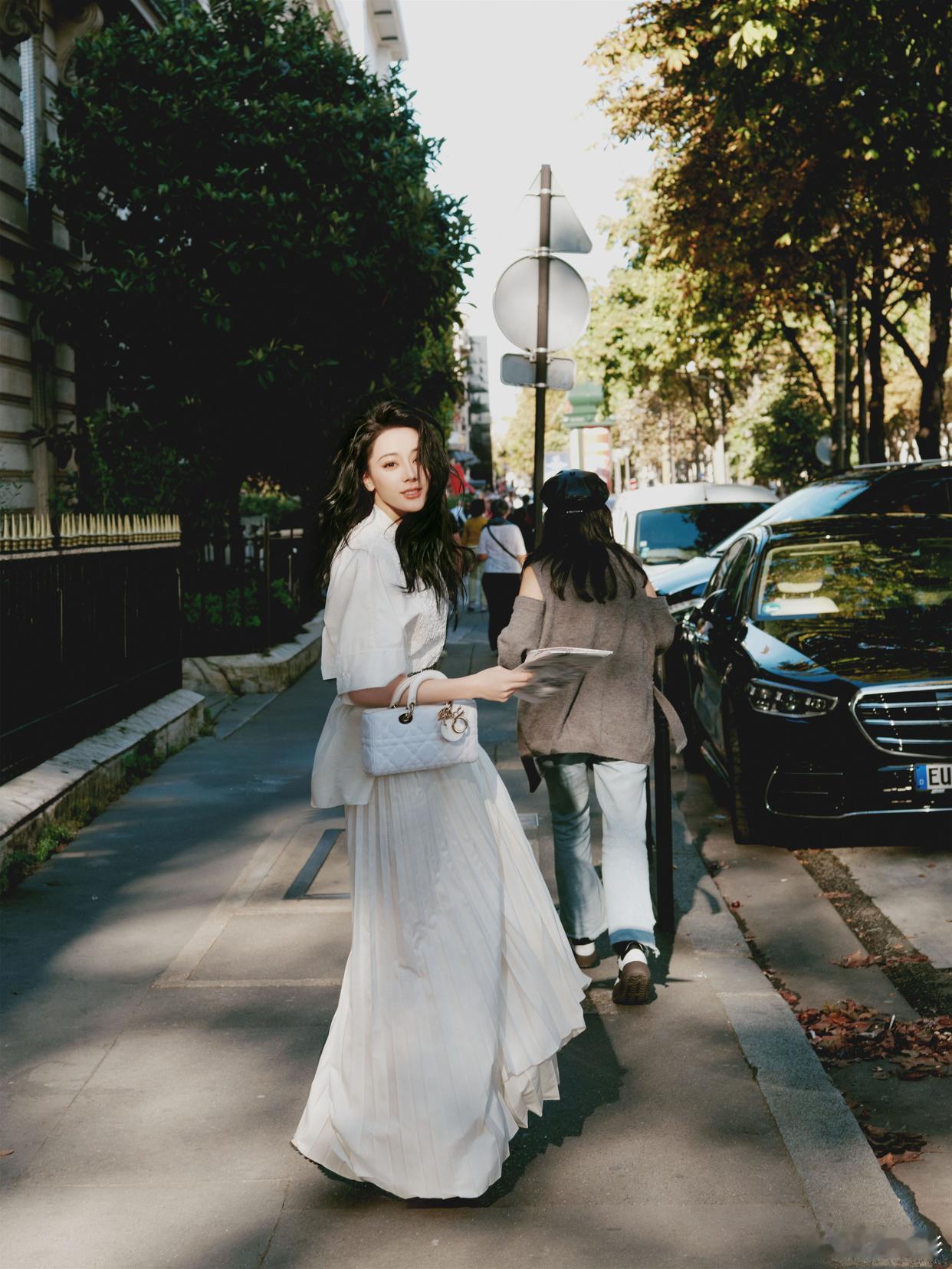 迪丽热巴撕拉片迪丽热巴Bonjour巴黎浪漫街拍写真:一身白色长裙,相约秀场,恬淡又舒适。