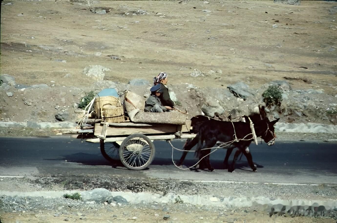 1986年,乌鲁木齐郊外的公路上,一对母子正赶着驴车前行。车上装着从集市上采购的蔬菜等物品。当时的公路看上去很窄。