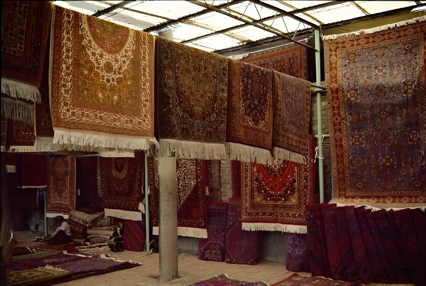 在市场一角,有一家卖地毯的商家。竹竿上挂满了各种精美的毯子。