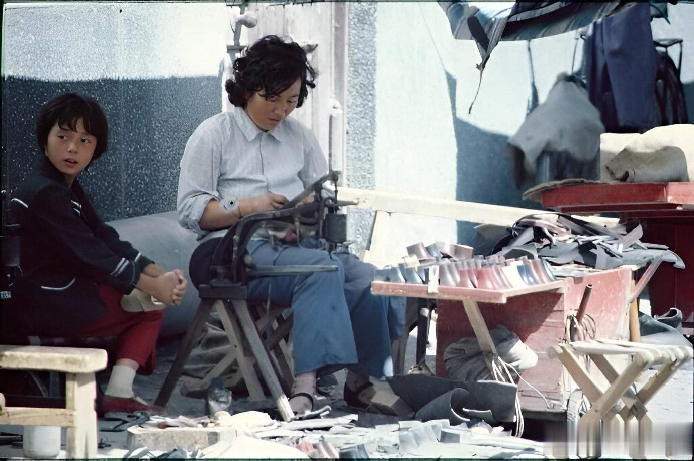 1986年,乌鲁木齐街头,一名鞋匠正在为顾客修鞋。虽然工作不起眼,但是依靠自己勤劳的双手,为人民服务,平凡中有伟大。