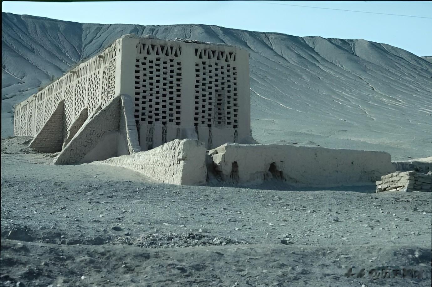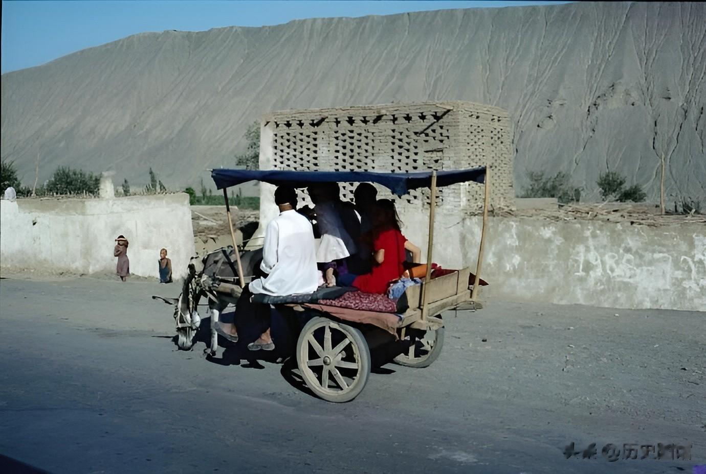在过去的乌鲁木齐,这种驴车是主要的交通工具。照片中一家人坐着驴车进城。路旁有一座晾房,四面墙壁为镂空结构。