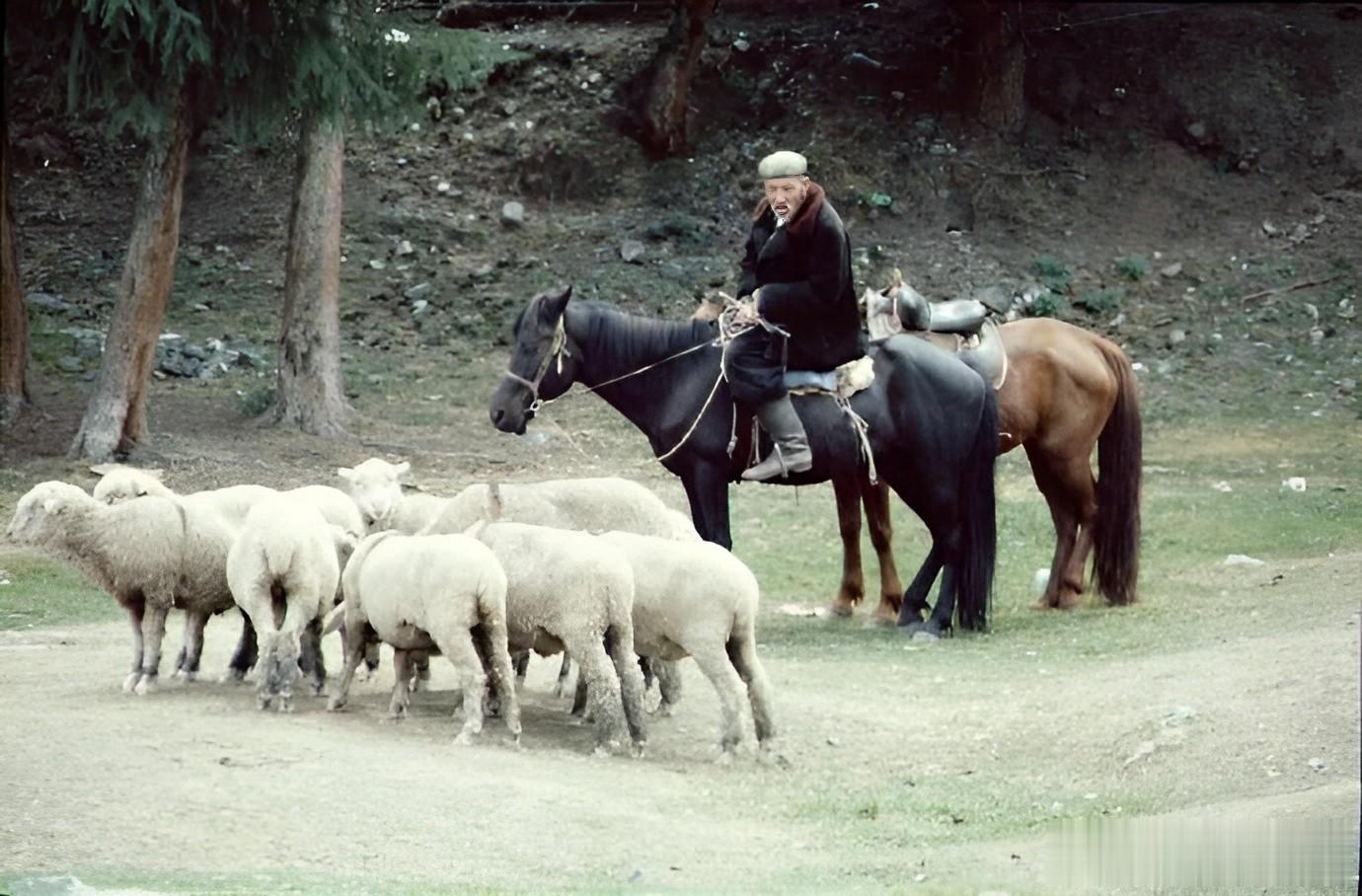 1986年,当地一名老人,骑着马匹赶着自己家的绵羊放牧归来。