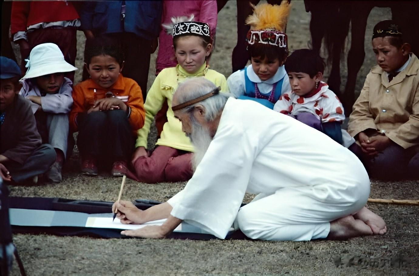 在当地举办的一次盛会上,一名老者跪在地上,用笔在一张纸上写着什么。旁边蹲着几个孩子,好奇地观看。