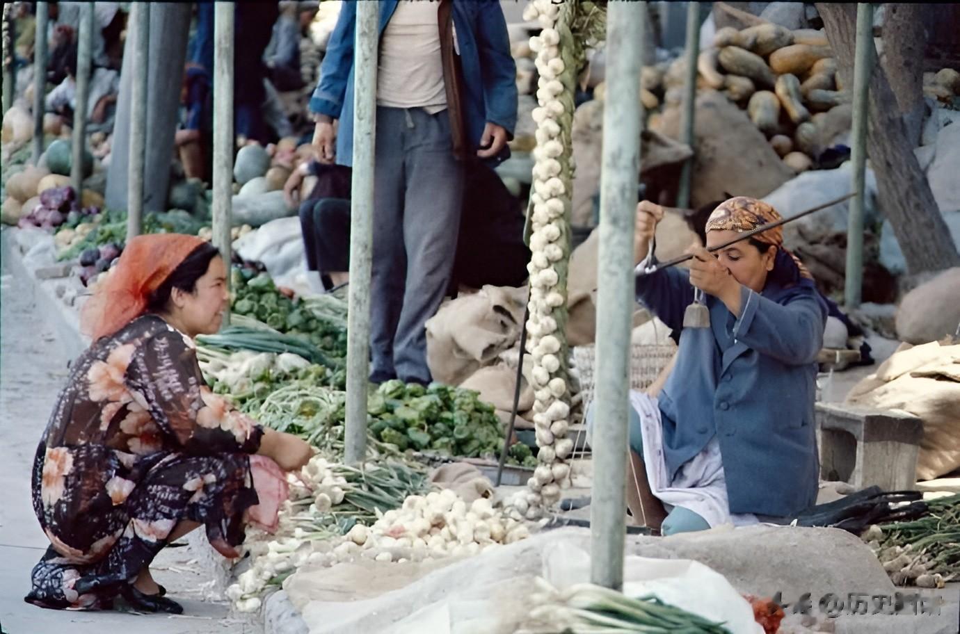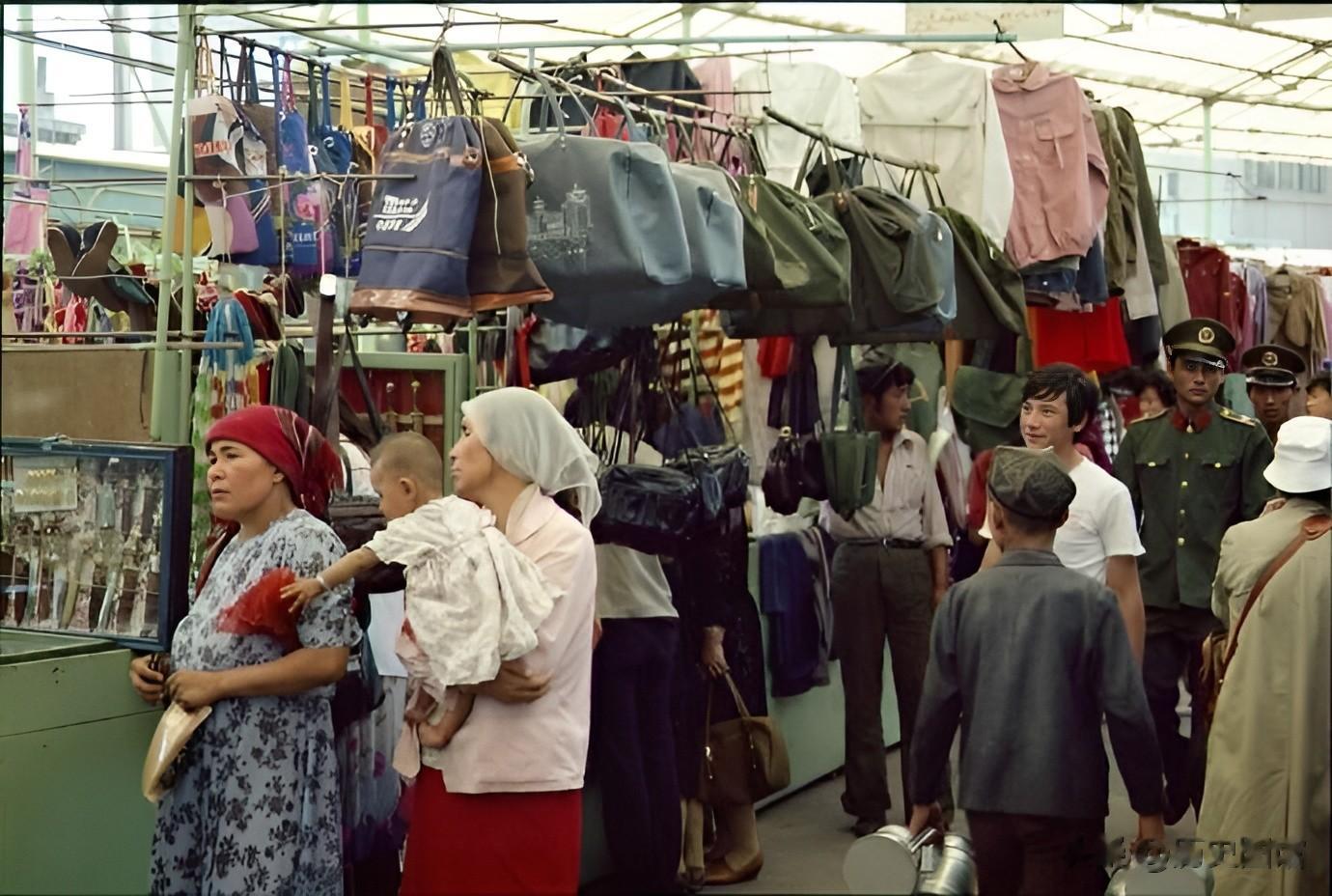 这是1986年乌鲁木齐街头一个集市,看上去很热闹。街边摊位上摆着衣服和提包等各种各样的商品,逛街的人摩肩擦踵。人们的服饰很有年代感。