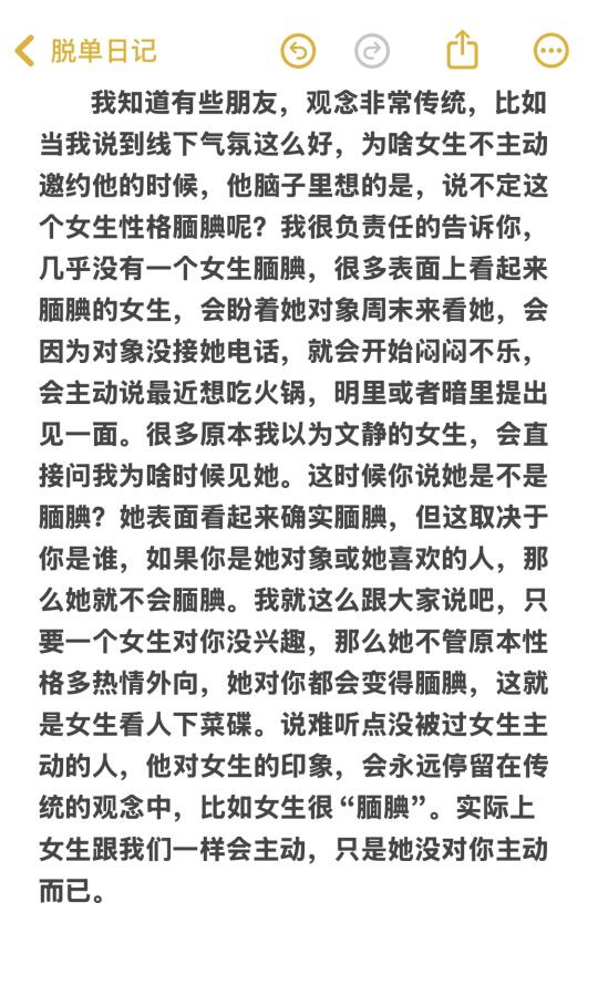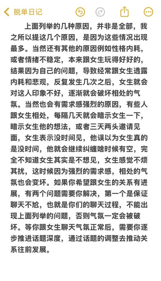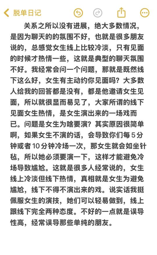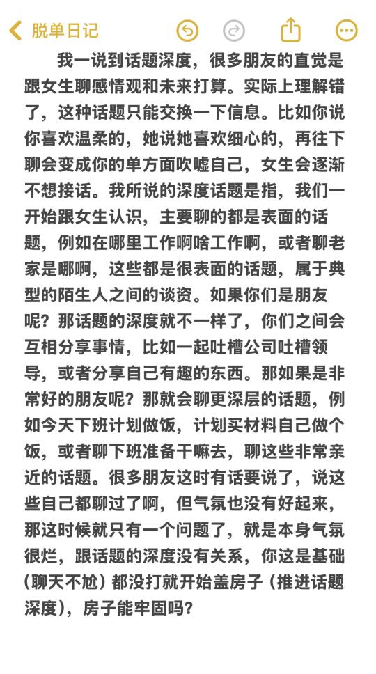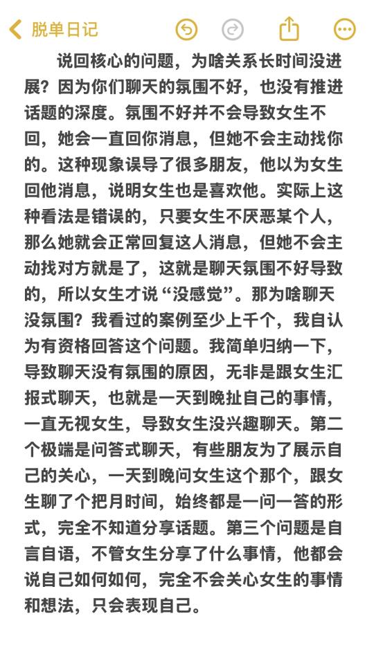省流版: 1)推进关系必须同时满足两个点:1.聊天不尴尬,气氛至少要不错,你和女生互相都会主动发起聊天。2.有意识的推进话题的深度,不能一直在聊那些表面的话题,避免关系原地踏步。 2)关系的提升很像剥洋葱,层层递进。并非一直坚持打卡聊天,然后女生突然有一天被感动并实现关系的提升,这是痴人说梦。 主页🈶更多实用的知识和技巧~