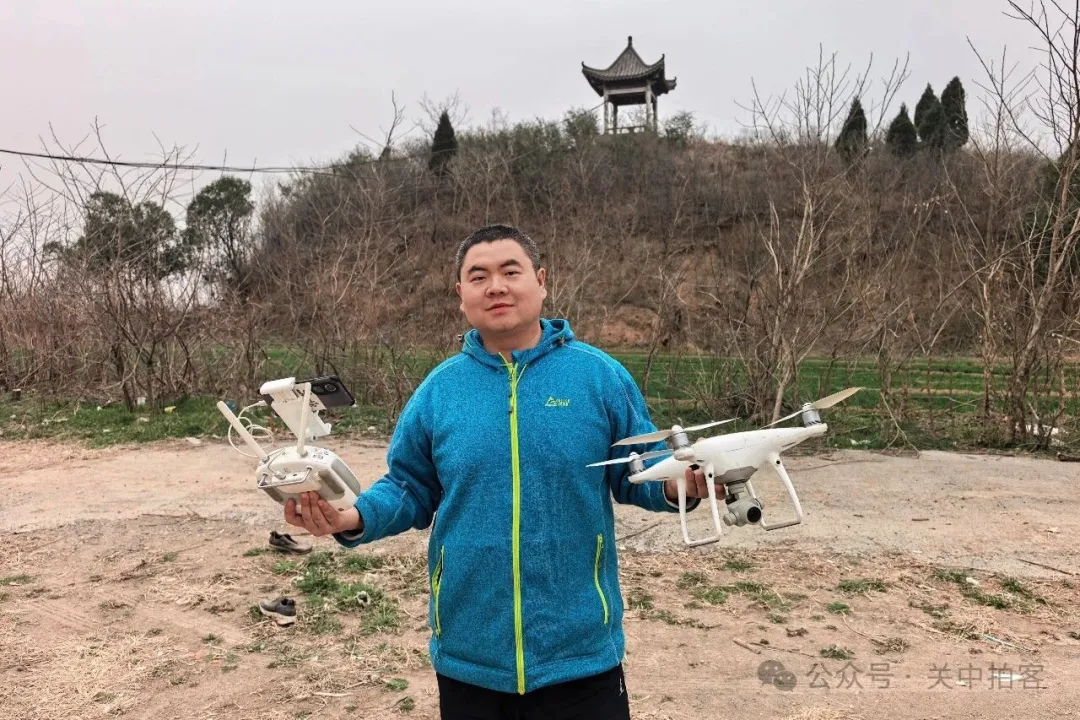 在盘龙冢北边的空地上,我使用无人机对墓冢进行航拍,环绕飞行两圈儿,从不同角度拍摄。盘龙冢坐北朝南,封土呈“凹”字形,好像一把“太师椅”。