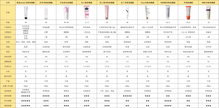 为了让大家快速看清这10款身体素颜霜的核心差异,我整理了一份实测参数对比表,所有数据都是这14天我自己实测出来的,不掺假、不虚标,重点看妆感、持妆时长、成膜速度、质地、成分安全性这些关键指标,帮大家快速初步筛选。