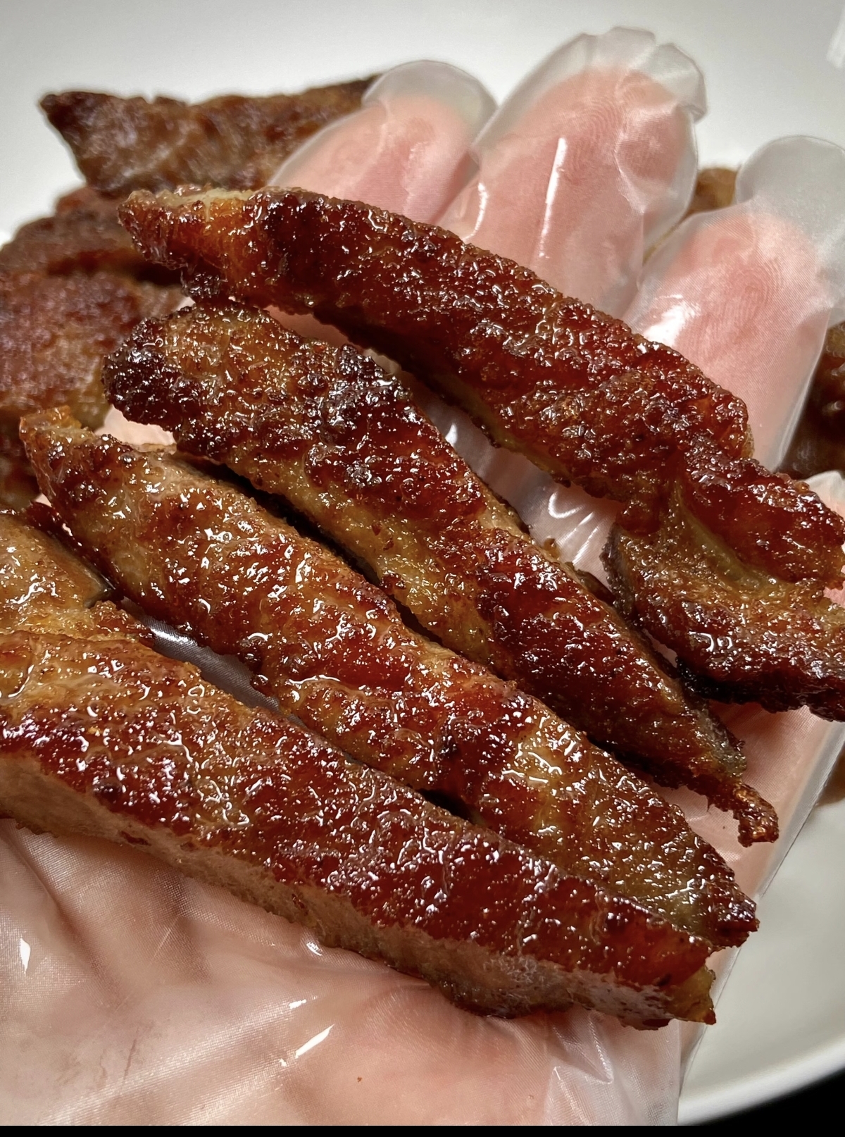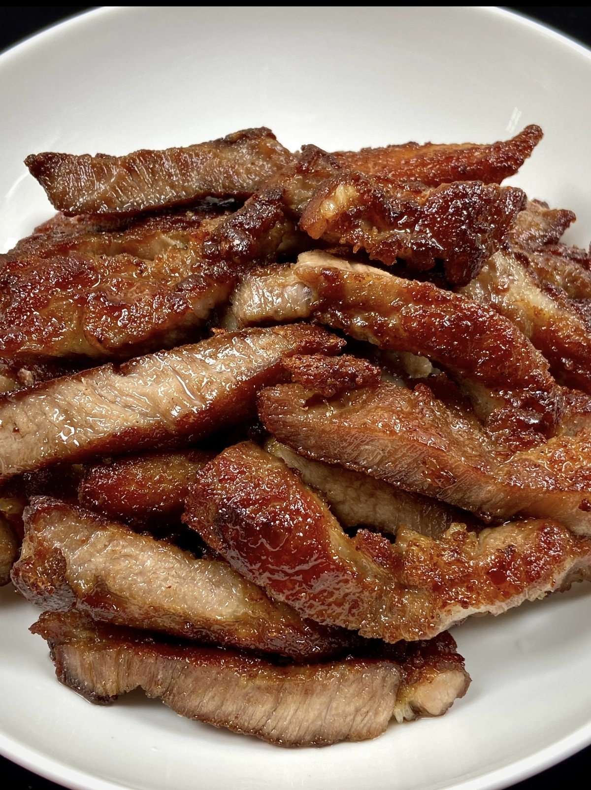 平底不粘锅烧热,倒入少许油,油热后将肉片一片片平铺入锅,中小火慢煎。切记不要急着翻动,等底面定型、呈金黄色后再翻面。两面煎至微焦、肉片微微卷起时,就可以出锅了。喜欢蒜香的,可以在出锅前放入蒜末快速翻炒几下,香气更浓郁。如果锅够热,还能听到“滋啦”一声,那是幸福的声音。