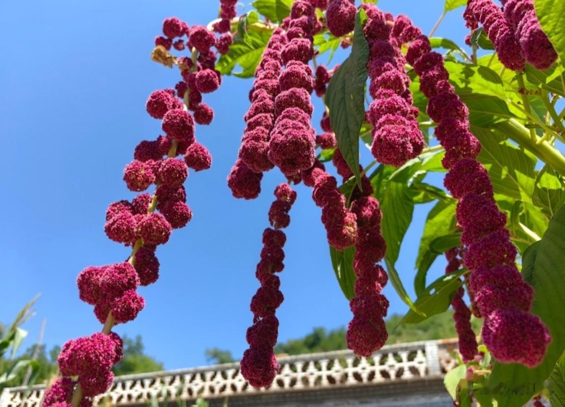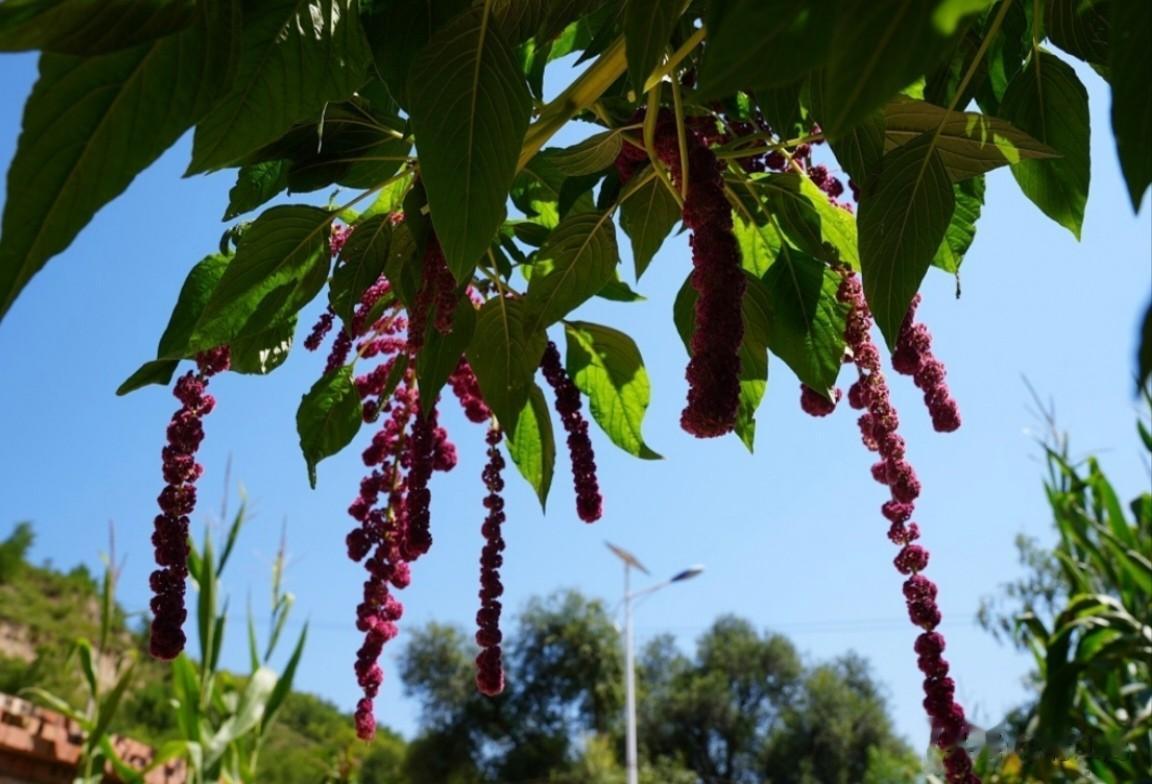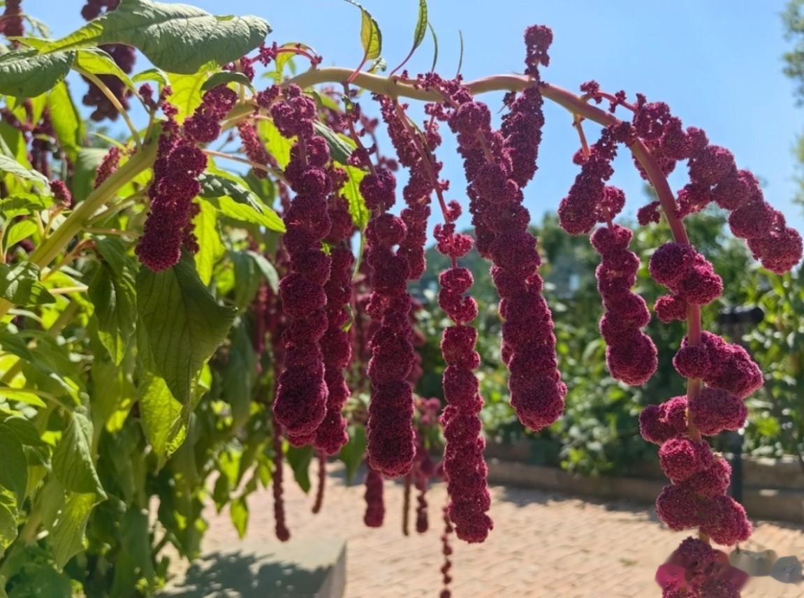一是尾穗苋的观赏价值较高:尾穗苋圆锥花序细长下垂,穗状花簇密集,颜色深红或紫红色,宛如精致小灯笼,在绿叶映衬下格外耀眼。花序未成熟时为绿色,成熟后呈现橙、黄乃至猩红色,如瀑布般自然垂落,艳丽撩人。在花的世界,它被称为“柔丽丝”“情人泪”或“少女长发”,是理想的观赏植物。