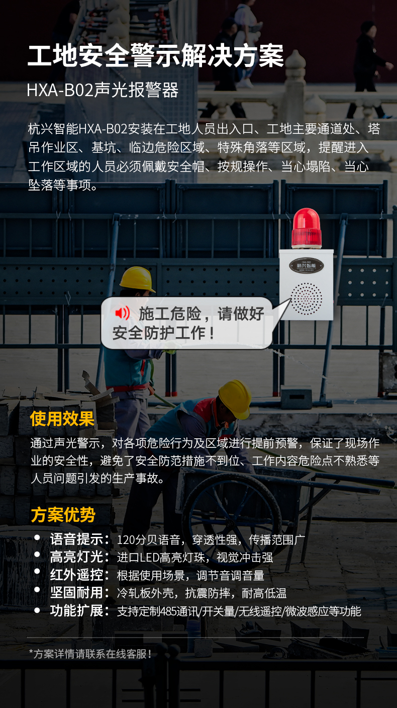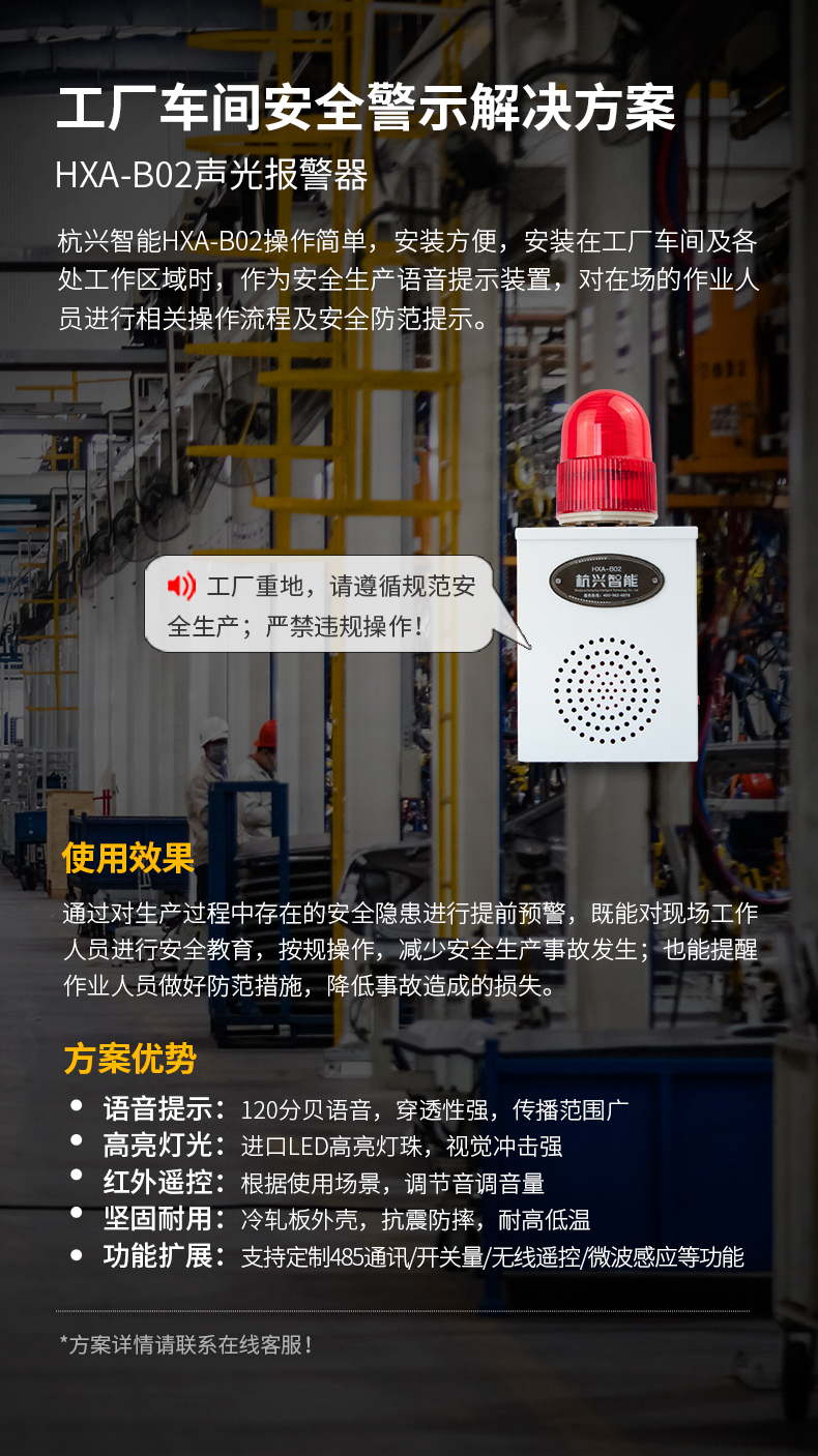 今天,安全防护已步入智能化、精准化的时代。杭兴智能推出的HXA-B02声光报警器,正是一款旨在从根本上解决上述痛点的全能型安防利器。它不仅仅是一个发出警报的设备,更是一套集高强度警示、灵活适配与智能控制于一体的主动式安全解决方案,致力于成为各类高风险环境的“标准化安全语言”。