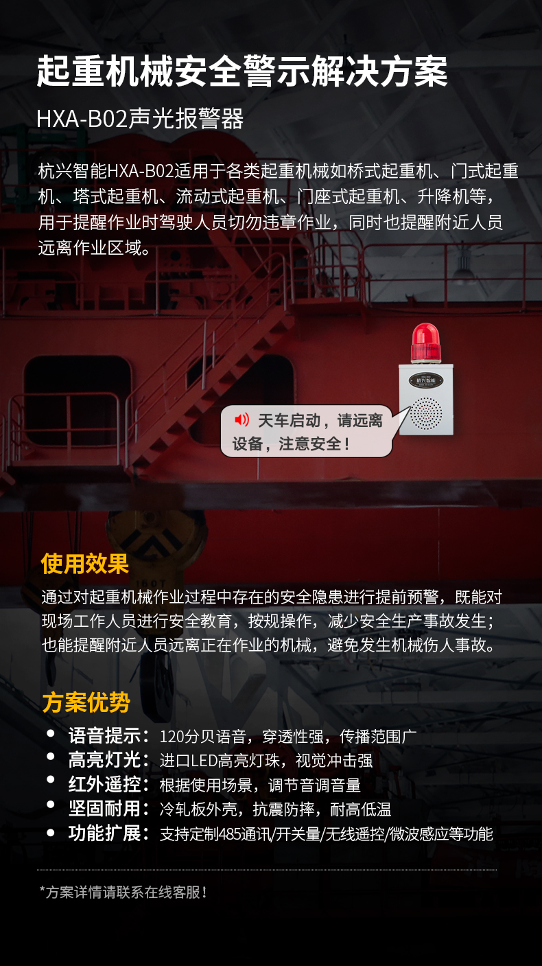 大型工业与起重运输:在工厂车间、港口码头、冶金矿山等场所,它是桥式起重机、门式起重机、港口机械等大型移动设备的“标配嗓音”。设备启动或运行时,HXA-B02发出的强烈声光信号能有效提醒地面人员注意避让,极大预防了碰撞、挤压等恶性事故。